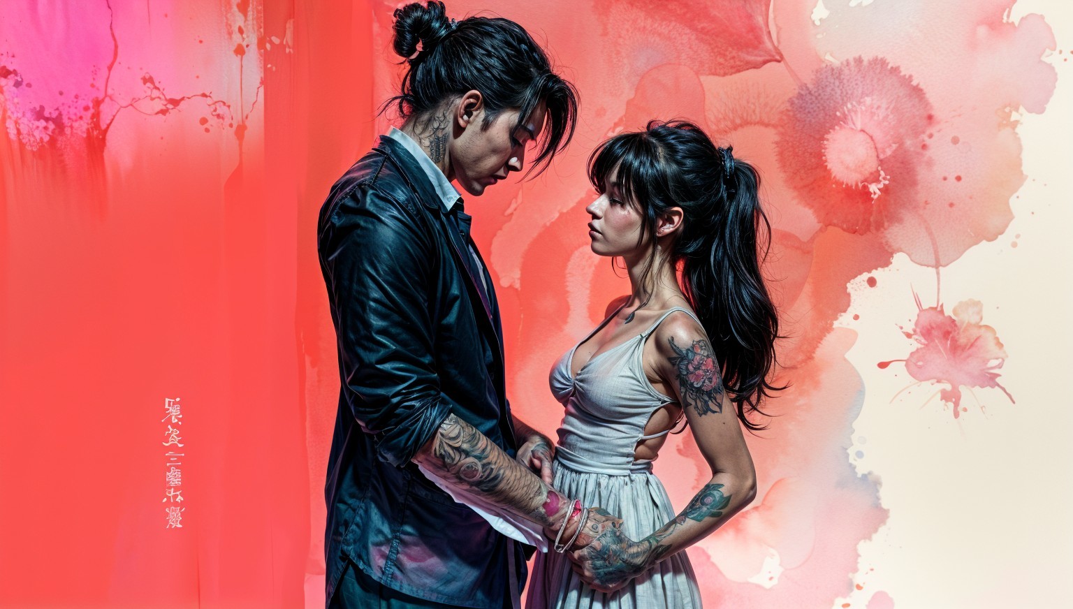 A profile view of a man with a sleek hairstyle and visible tattoos. He's wearing a dark button-up shirt, and the background features a smoky, artistic effect with splashes of light.