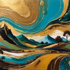 A vibrant landscape features a golden tree against a blue sky adorned with swirling clouds and a radiant sun. Rolling hills and a quaint house complete the serene, whimsical scene.