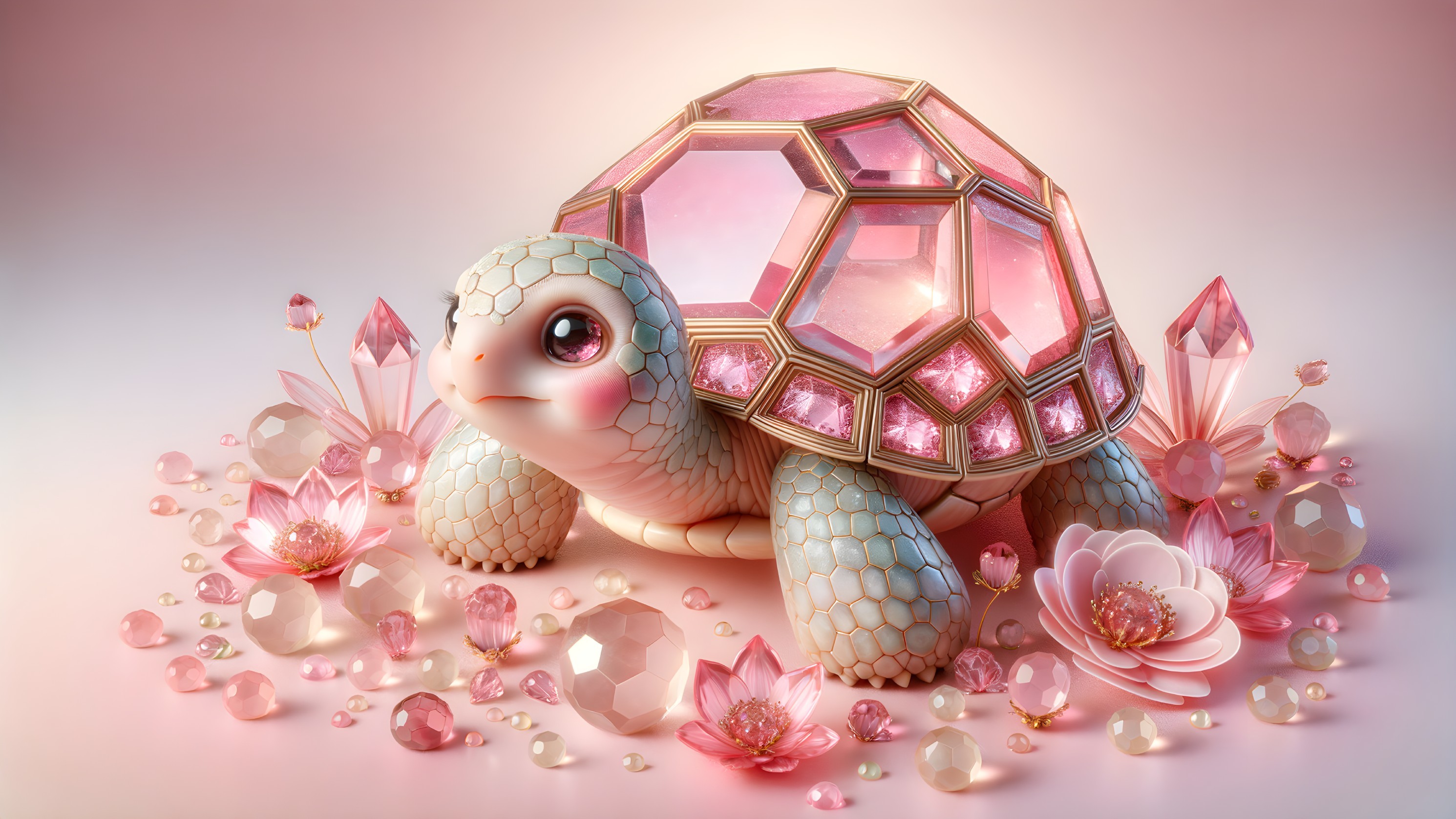A whimsical turtle with a pink gemstone-like shell rests on soft pastel pink crystals, surrounded by delicate floral elements. Its light body features textured patterns, and expressive eyes shine brightly, creating a serene, dreamy atmosphere.
