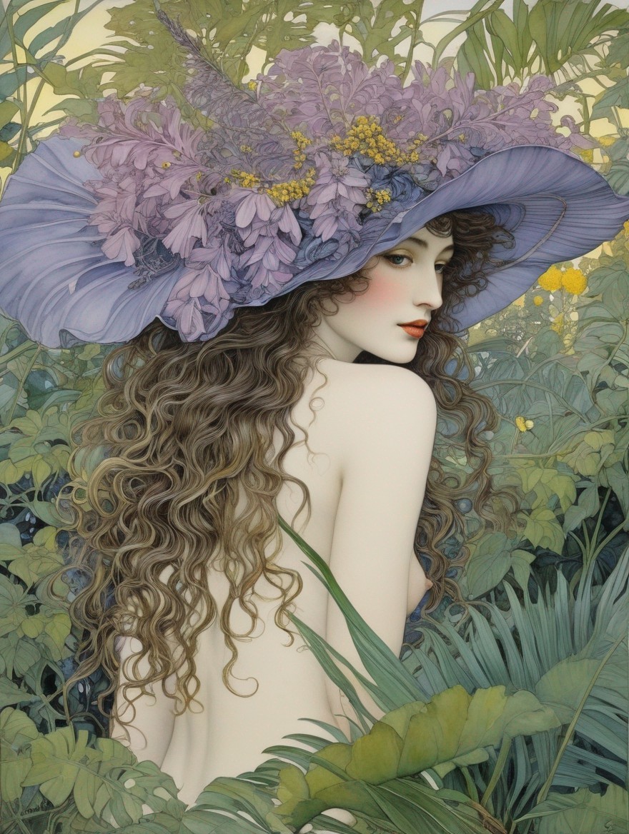 A portrait of a woman with curly hair, wearing a wide-brimmed yellow hat, amid a lush tropical background.