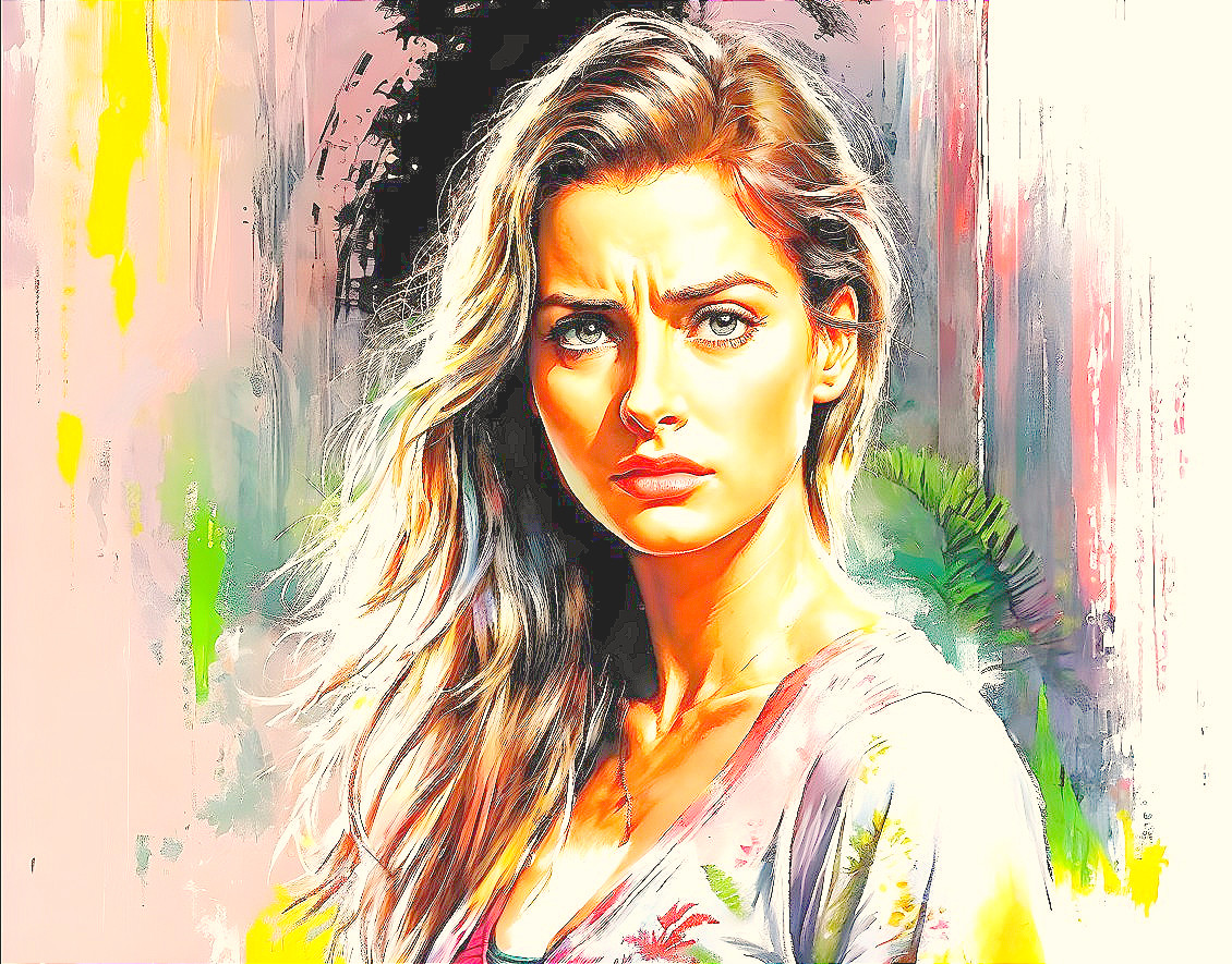 Colorful digital portrait of a woman with intense gaze, against a vibrant, abstract background.