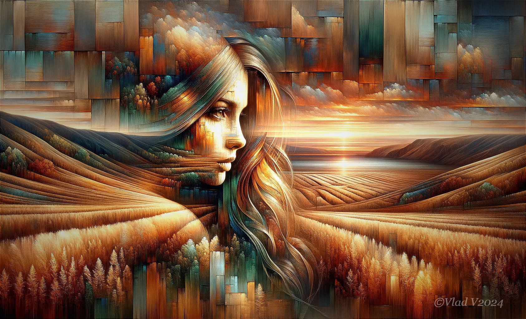 A digital artwork blending a woman's profile with an intricate landscape featuring golden fields, forests, and a sunset over water.