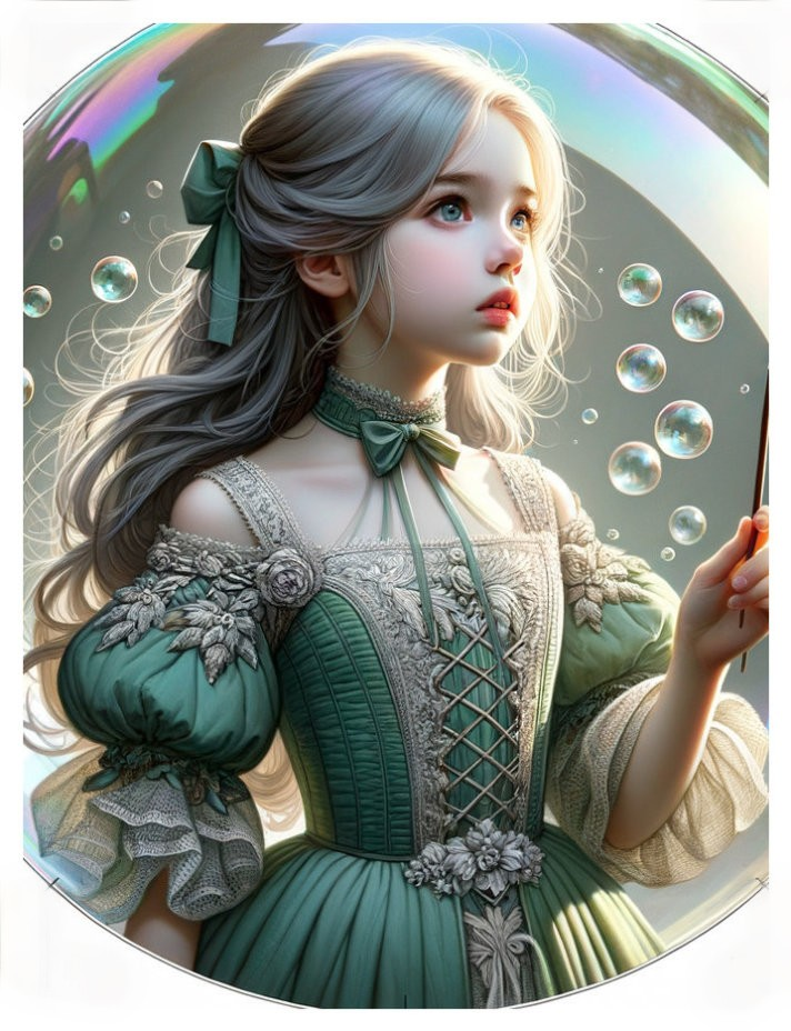 An illustration of a girl with silver hair and blue eyes, wearing a frilly blue dress and a bow, with bubbles floating around her.