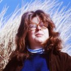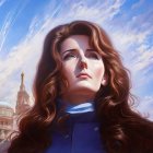 A young woman with long, wavy hair gazes thoughtfully into the distance, framed by feathery grass against a bright blue sky. Her expression is serene and contemplative, adding depth to the scene.