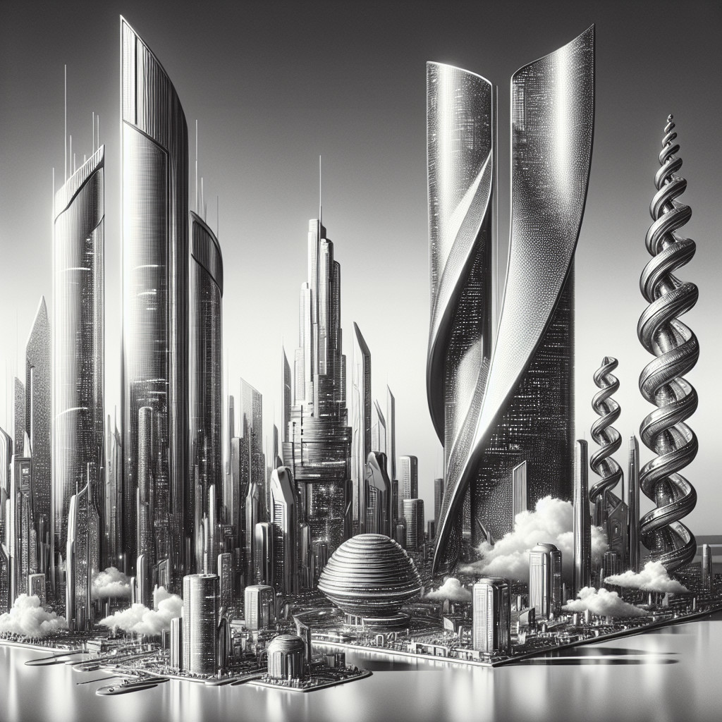 A futuristic cityscape features sleek, twisting skyscrapers reflecting in a calm waterway. The skyline showcases innovative architecture and vibrant clouds, creating an otherworldly atmosphere.