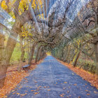 A winding path through a serene forest, lined with twisting trees ablaze in autumn hues. Golden light filters through the branches, illuminating a peaceful bench amidst fallen leaves.