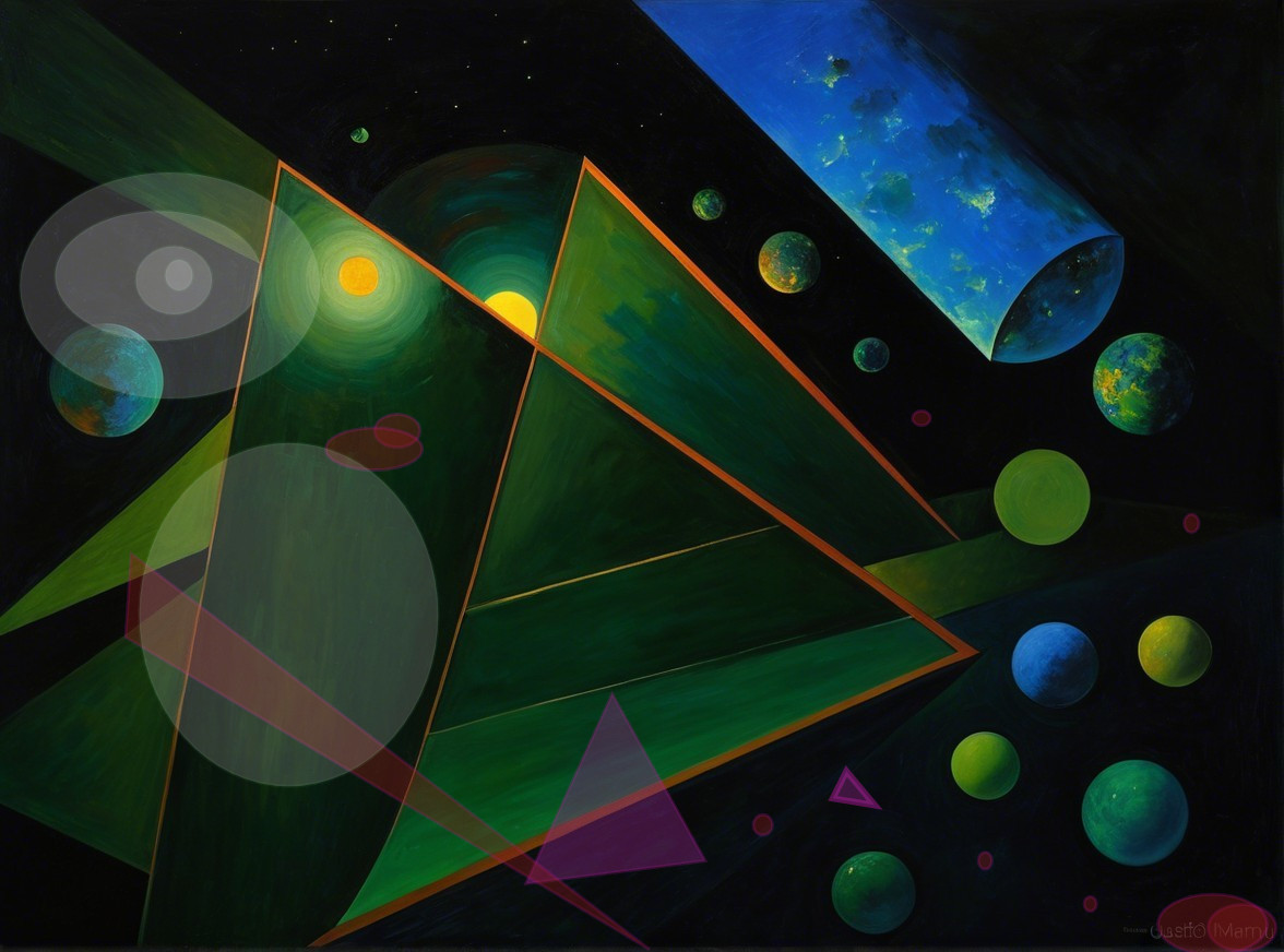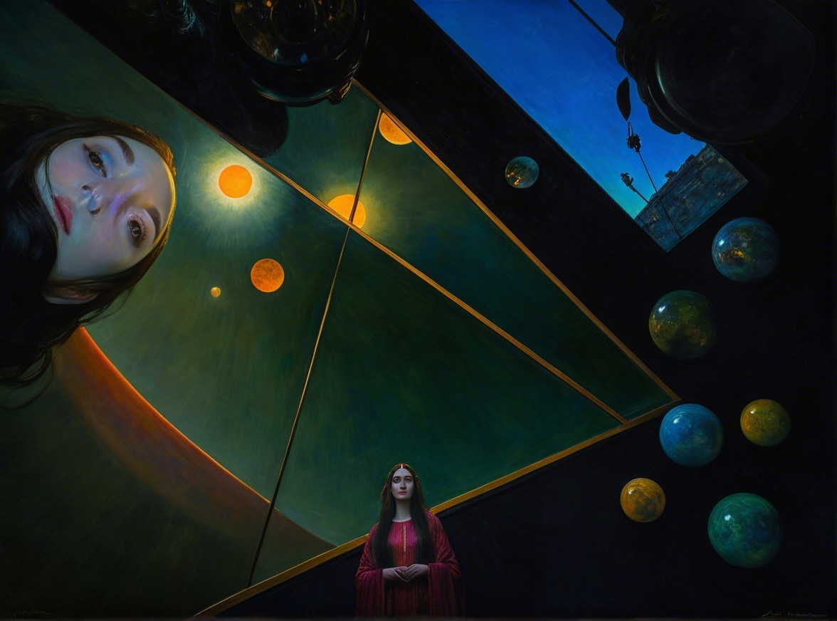 A surreal scene featuring a woman in a red dress, surrounded by celestial bodies and geometric shapes. The background depicts floating images, merging the cosmos with an ethereal atmosphere.