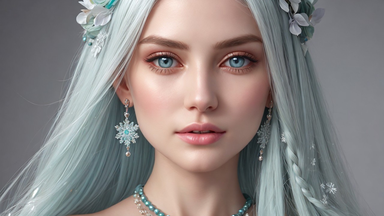 A close-up portrait of a young woman with long, ice-blue hair adorned with snowflake accessories, sparkling earrings, and a delicate necklace, exuding an ethereal winter beauty.