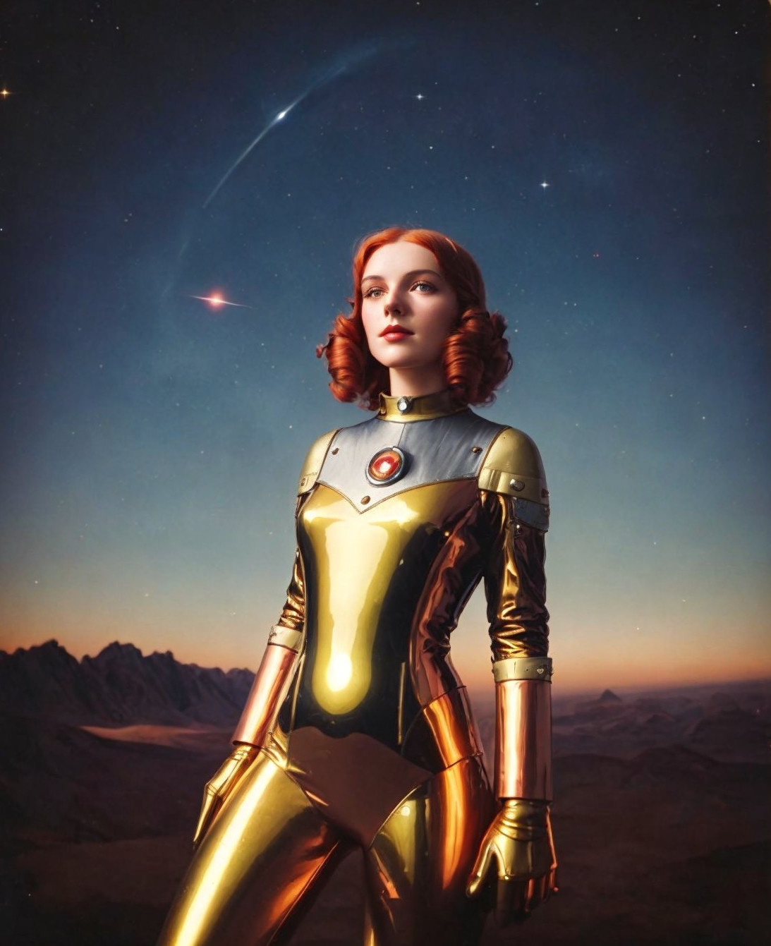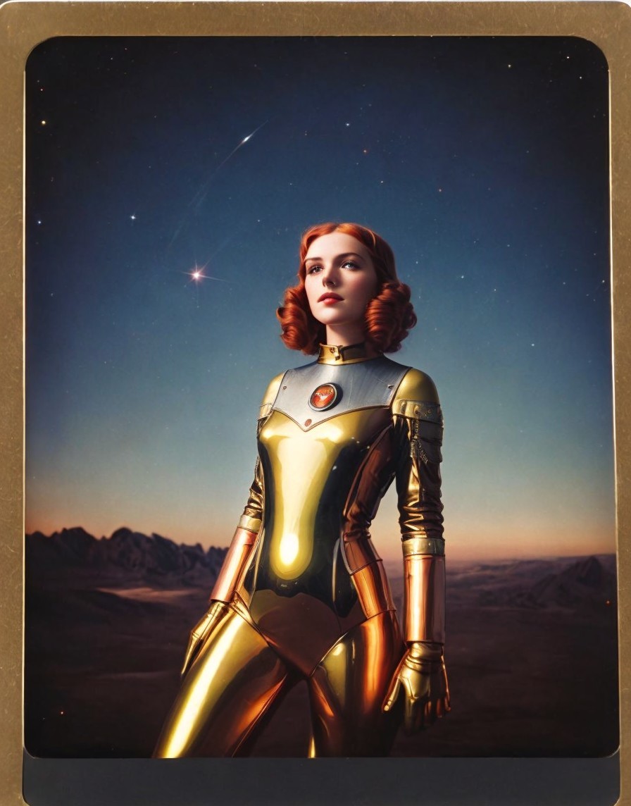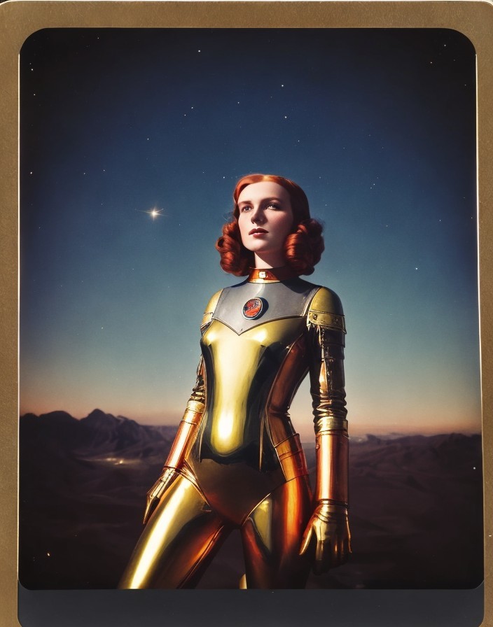 Prompt: "Polaroid, warm colours, brass metal, Art deco, art nouveau, space age, beautiful young woman, 1920s, 1930s, Fritz lang, science fiction, vintage, large breasts, space suite, stars in the background, space station, bakelite, copper, long red hair, dark sky, night sky, space"
