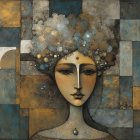 A painting of Cleopatra as a woman with long wavy auburn hair, prominent cheekbones, delicate pink blush, red lips, and grey eyes, wearing a silver sequined and beaded headdress, large ornate jeweled earrings, and a strapless teal, silver, and orange garment, with her left