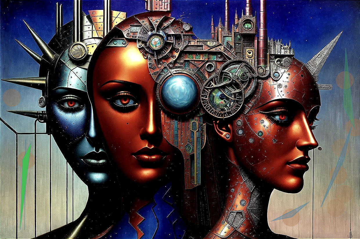 A surreal painting of two mechanical faces, one with gears and the other with architectural features, showcasing a blend of machinery and human elements.