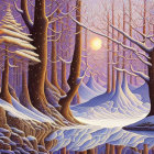 A serene winter scene features tall trees with pink blossoms, a gently flowing river, and silhouettes of people walking along the shore, all bathed in soft light from a rising sun.