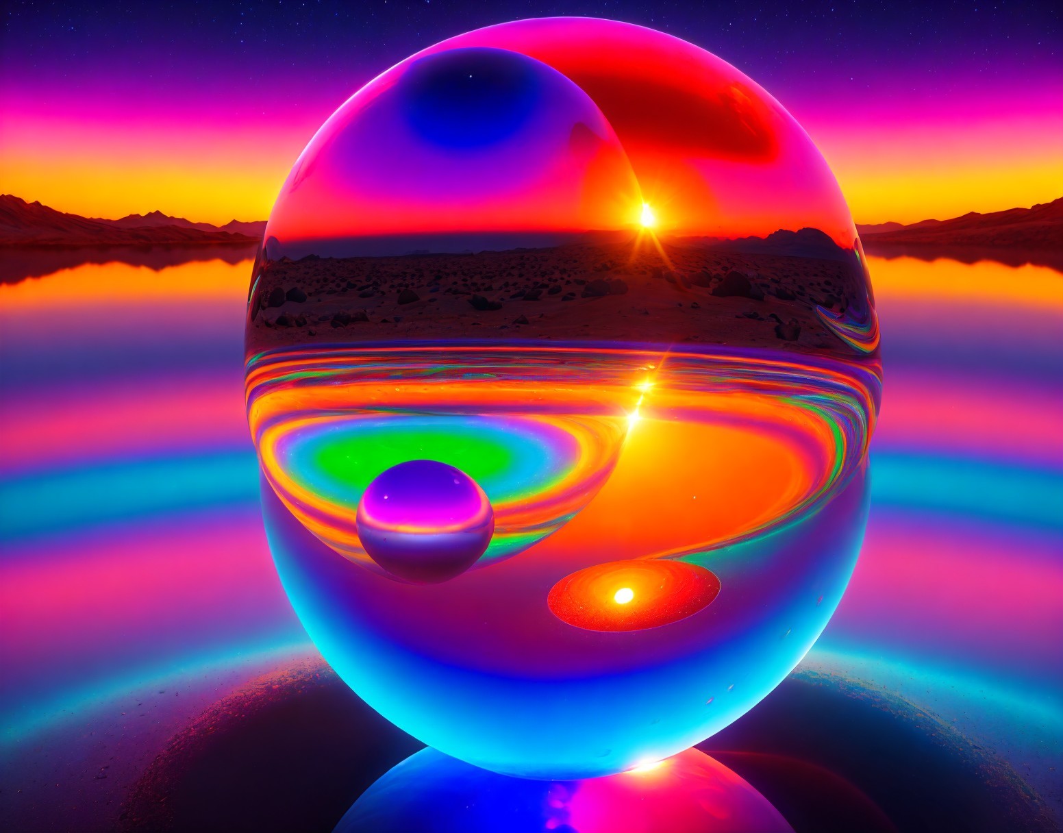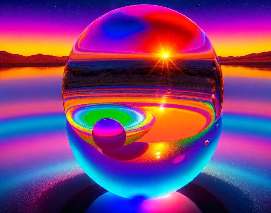 Colorful digital artwork: Reflective sphere on mirrored surface with sunset sky
