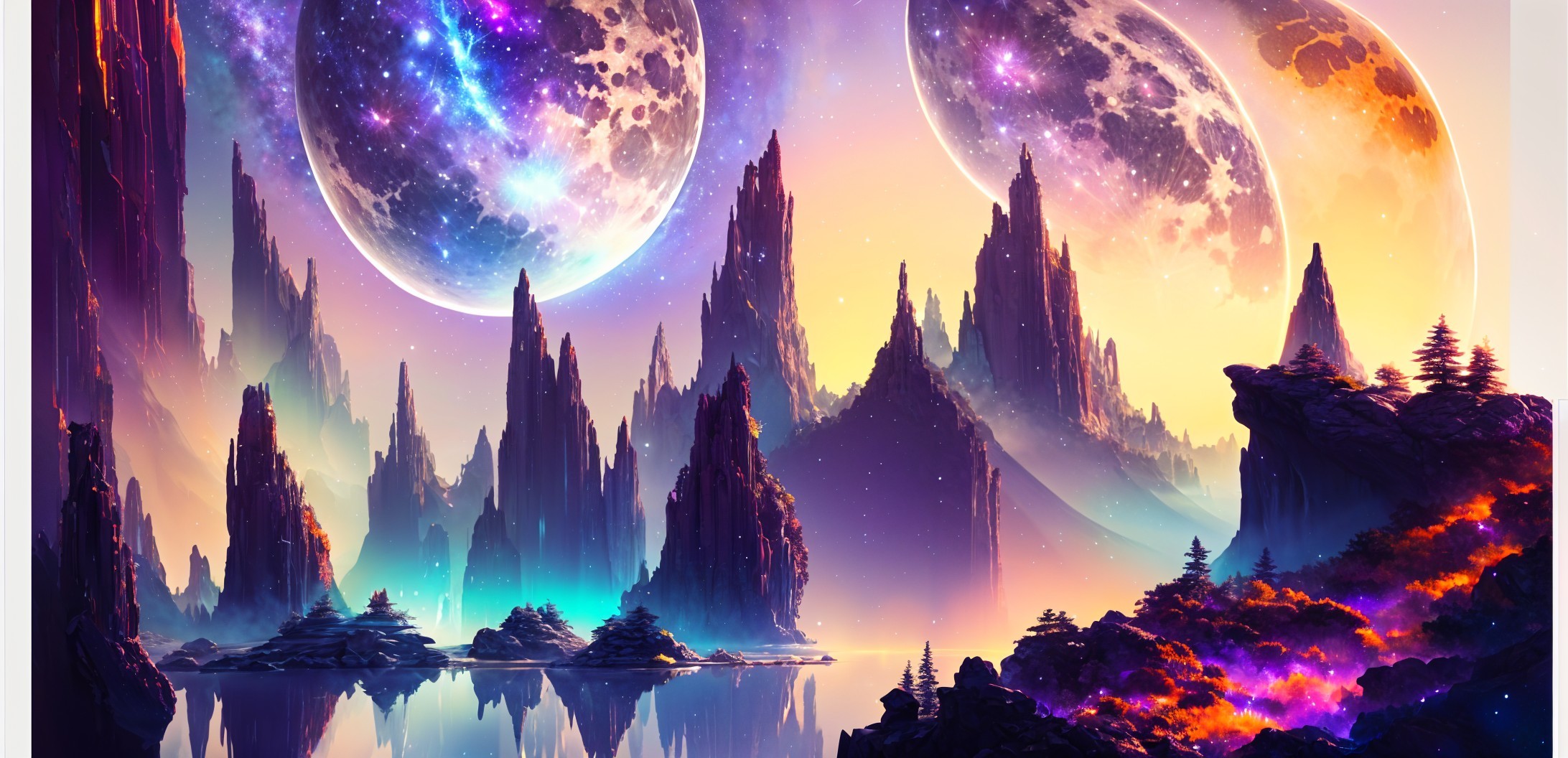 A vibrant cosmic landscape features towering mountains under a starry sky, two moons, and colorful hues of pink, purple, and blue reflecting in a tranquil lake surrounded by dark forests.