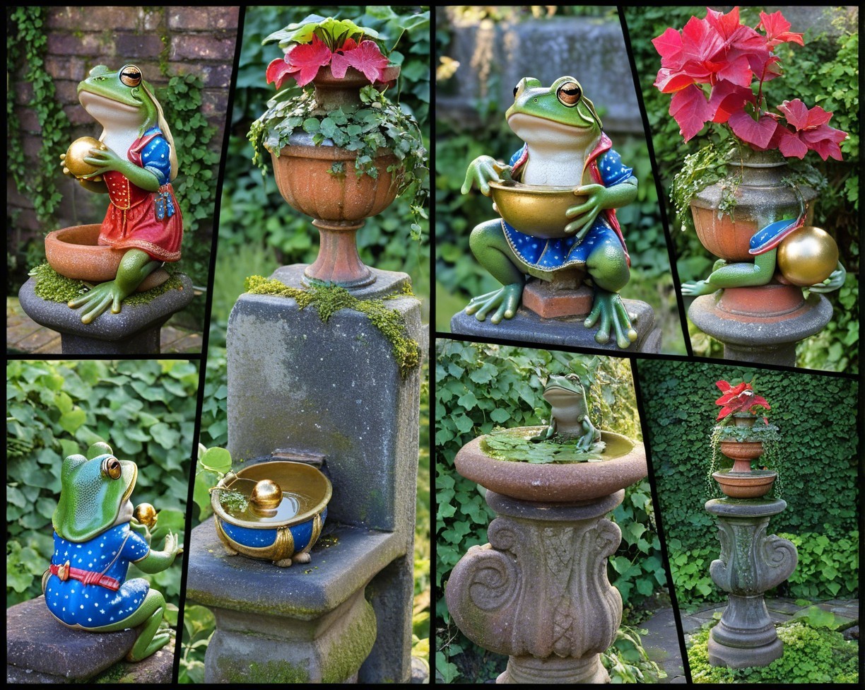 A collage of charming frog figurines in a garden setting, each adorned with vibrant plants and flowers. The frogs hold golden orbs and are surrounded by lush greenery, creating a whimsical atmosphere.