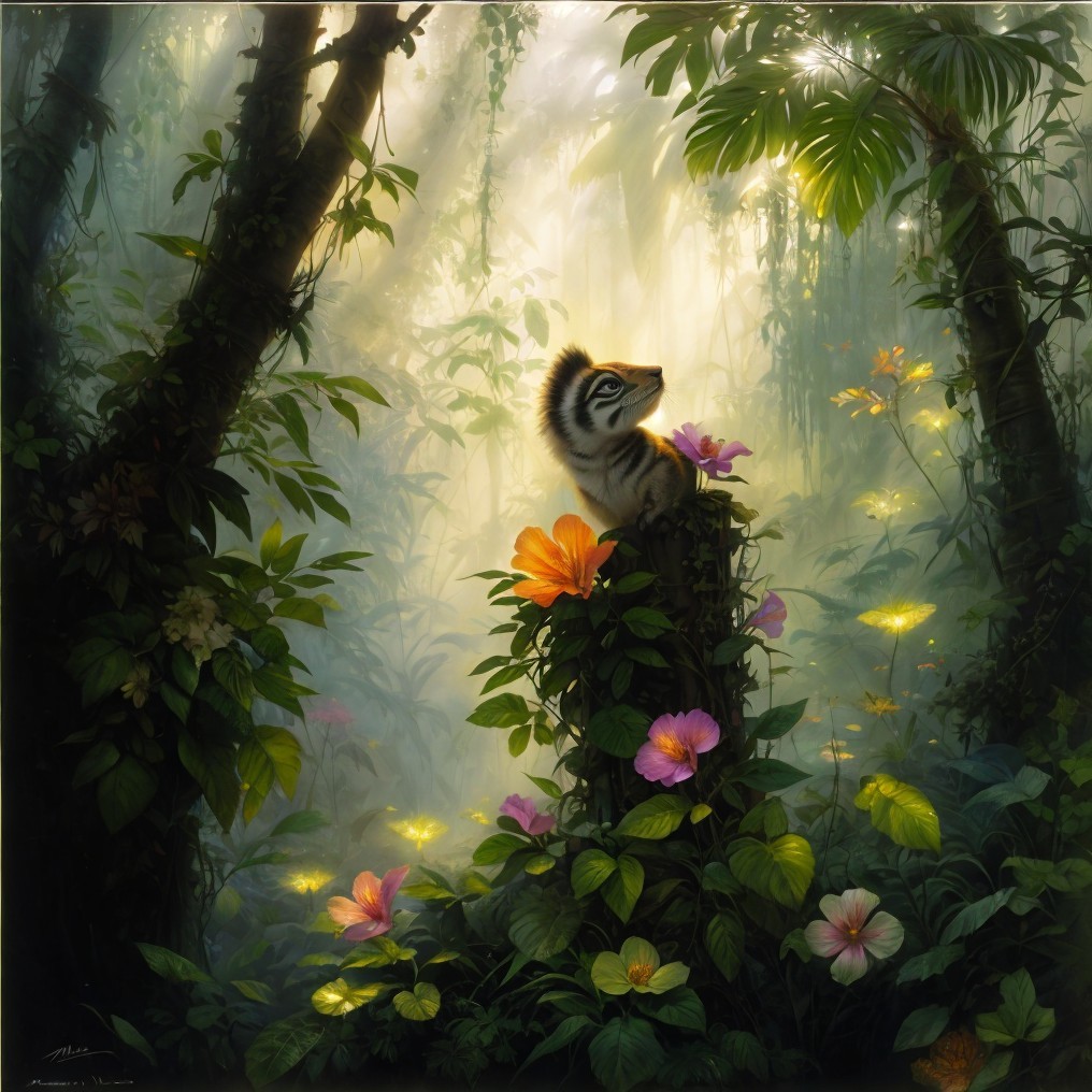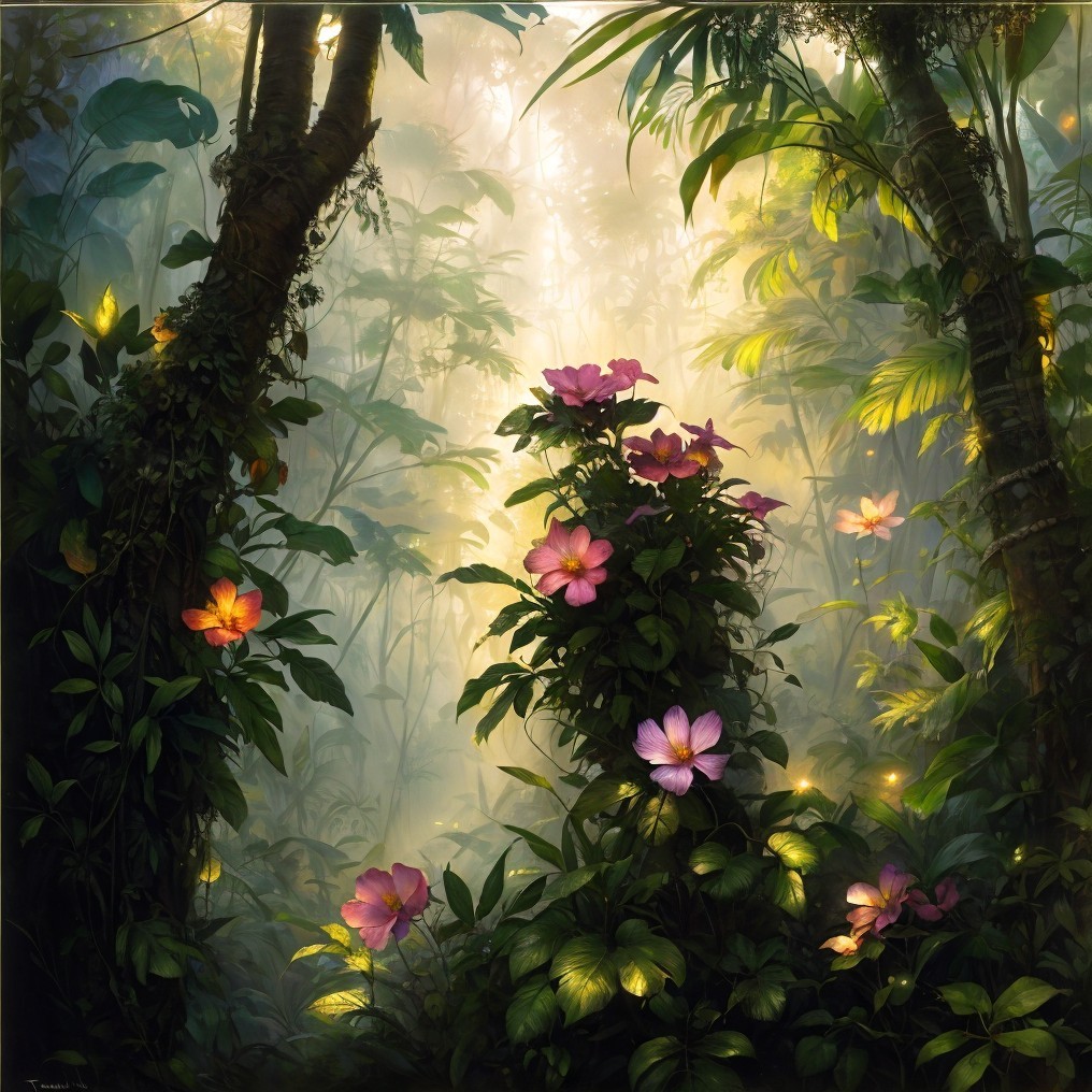 + Prompt:MADAGASCAR JUNGLE WITH HOLOGRAFIC ALIEN FLOWERS BY thomas wells schaller AND Jean-Baptiste Monge