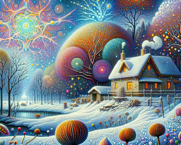 A dreamy, vibrant scene features a woman with flowing hair adorned with flowers, set against a mystical landscape of colorful trees and swirling skies, evoking a sense of enchantment and tranquility.