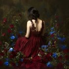 A woman in a burgundy gown sits among vibrant red roses and blue flowers. The dress features intricate floral lace on the back, creating a serene and elegant atmosphere.