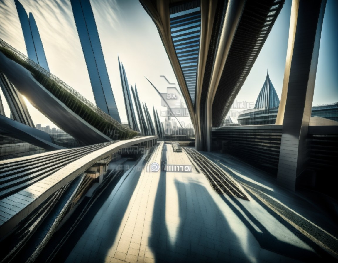 A futuristic cityscape with sleek buildings, a vibrant sky, and an illuminated, intricate bridge leading into the metropolitan skyline.