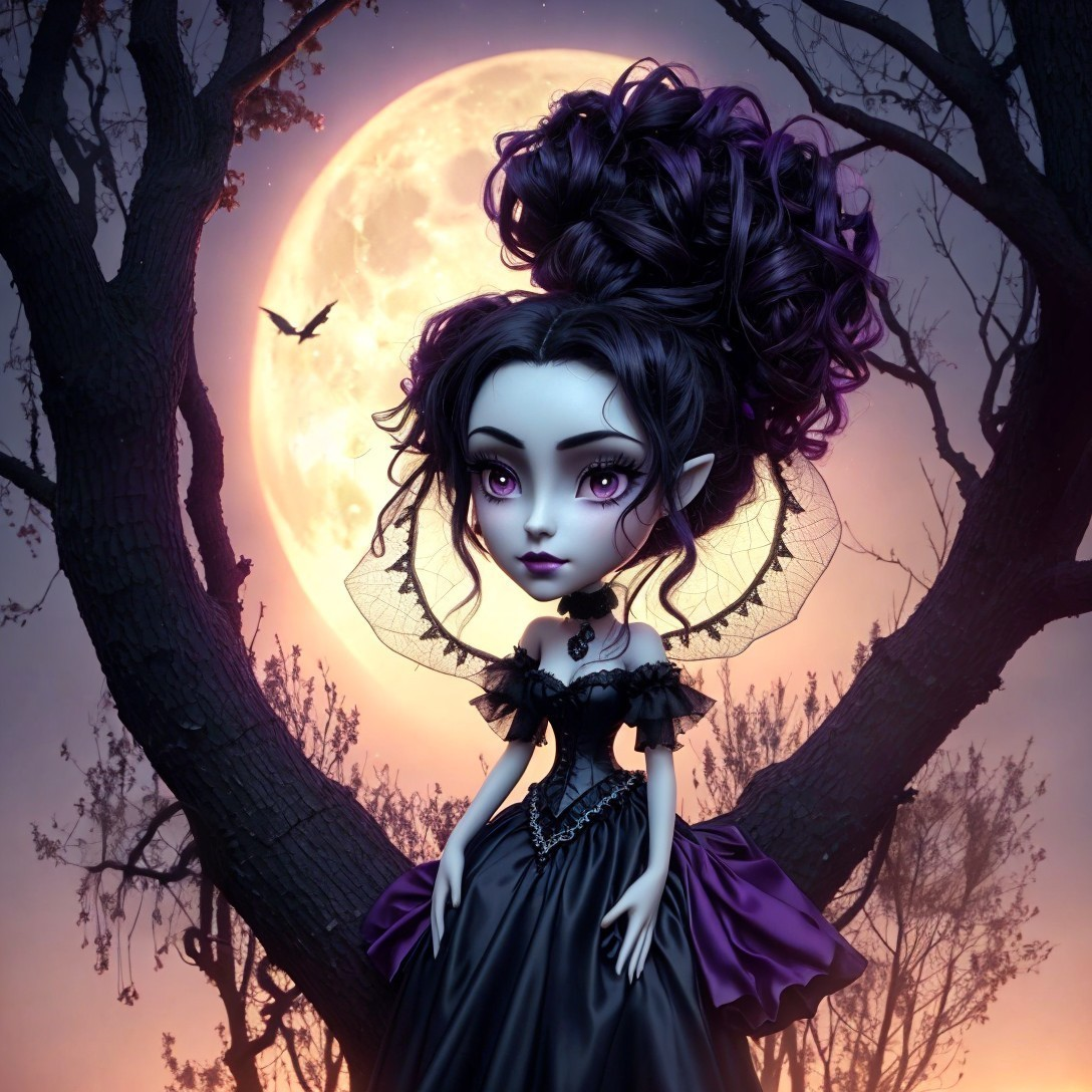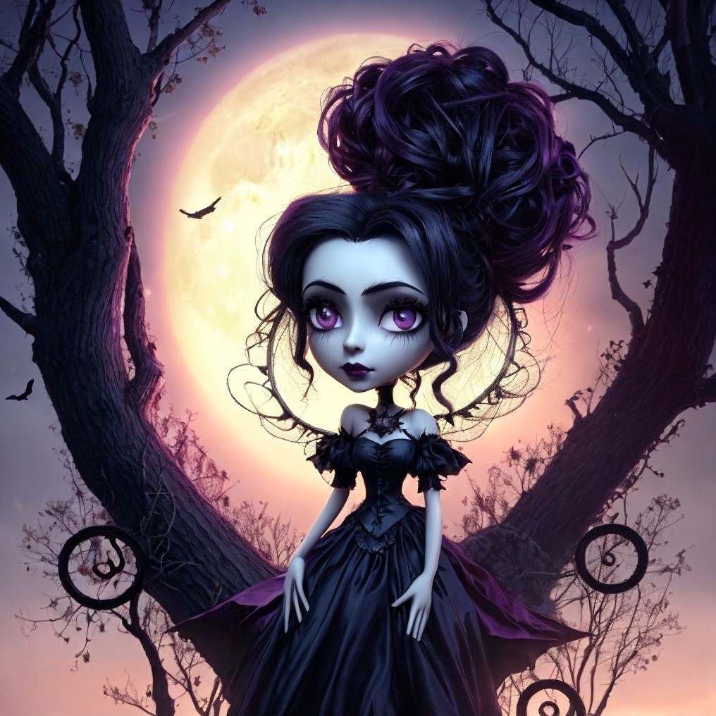 An illustrated gothic girl stands before a full moon with trees and a flying bird, conveying a whimsical yet eerie atmosphere.