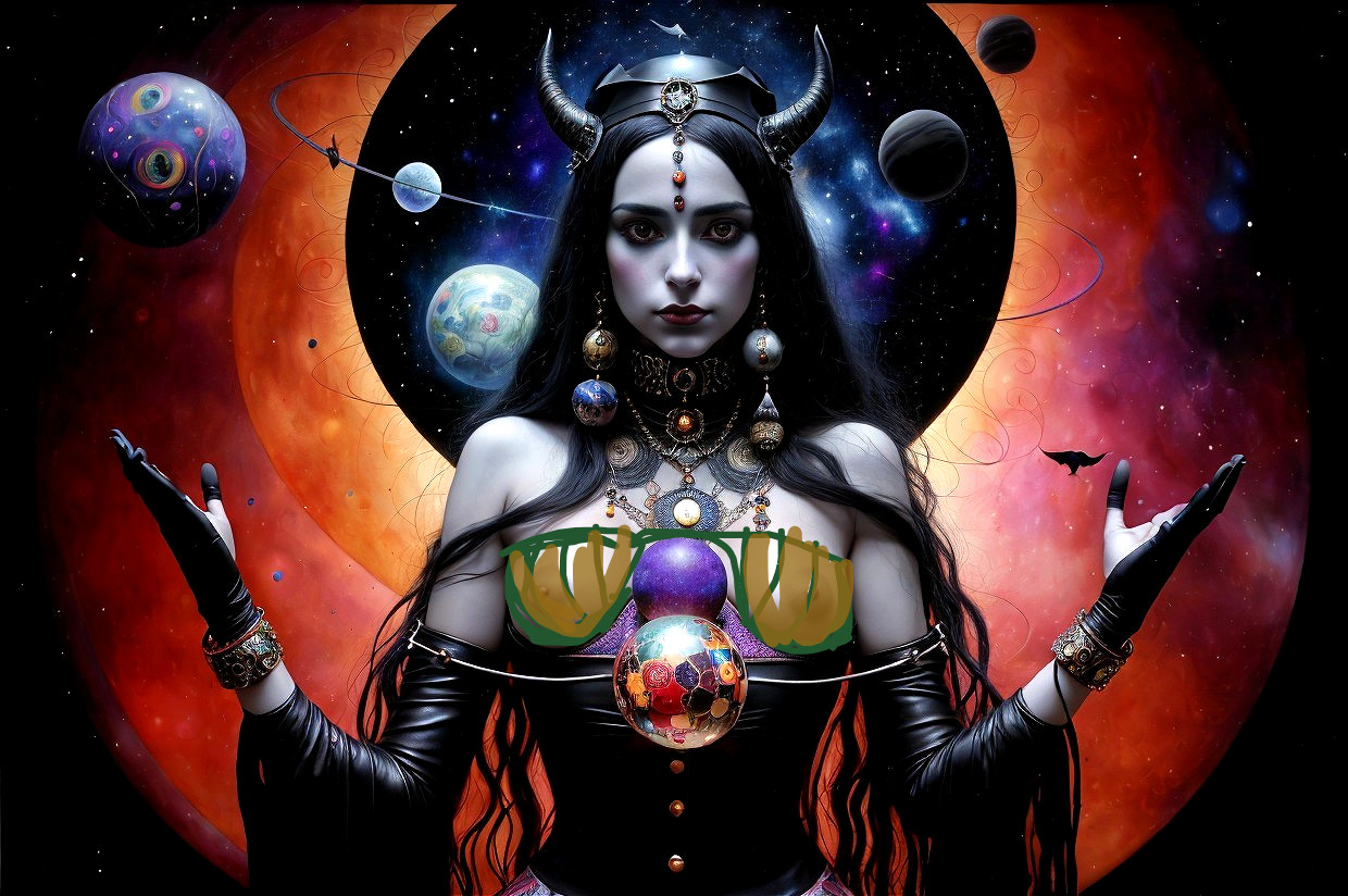 A mystical woman with horns and ornaments is surrounded by celestial bodies, embodying a cosmic sorceress theme. Very ballsy orbs.