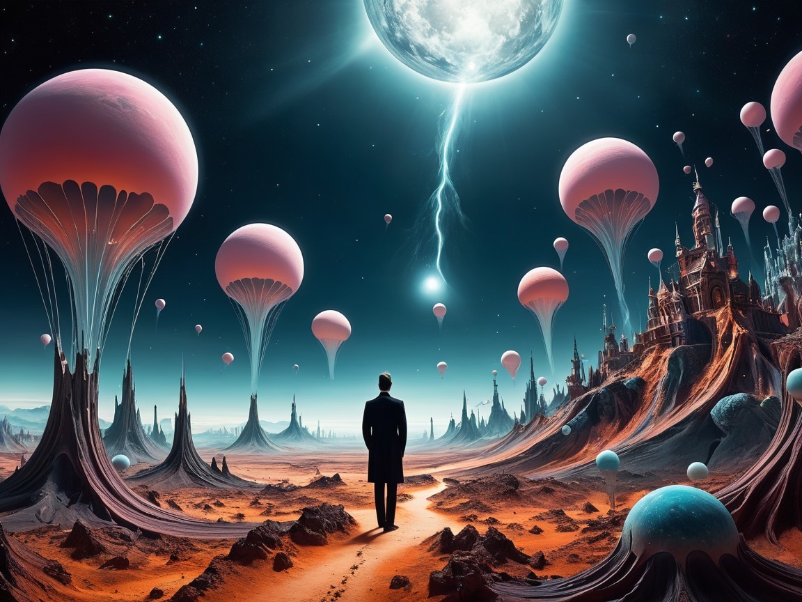 A surreal futuristic landscape at night, with a man looking away from the camera at the center-bottom, following a winding, glowing path into the distance. To his left, several large, dark, organic-looking structures with pointed tops rise from the orange ground, some with huge pink spherical balloons with