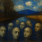 Oil painting on canvas in the style of Vincent van Gogh shows a group of heads of varying ages and sizes, in the style of golden statues, floating in dark blue water. The heads all have a realistic appearance but are rendered in a rough, textured, painterly style. The largest head is bald