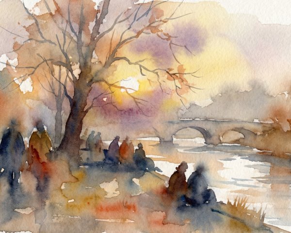 A silhouette of a woman by a tree, with a serene lake, flying birds, and a vivid crimson and blue sky.