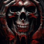 A haunting skeleton with piercing blue eyes, adorned with blood splatters, peeks from a dark cloak. Chains wrap around it, while a hand with red nails gestures ominously.