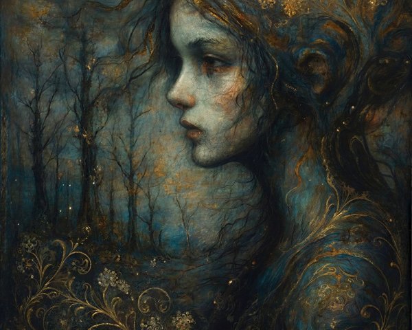 A vibrant artwork featuring a woman with a decorative crown, intricate patterns, and vivid colors, exuding a mystical aura.