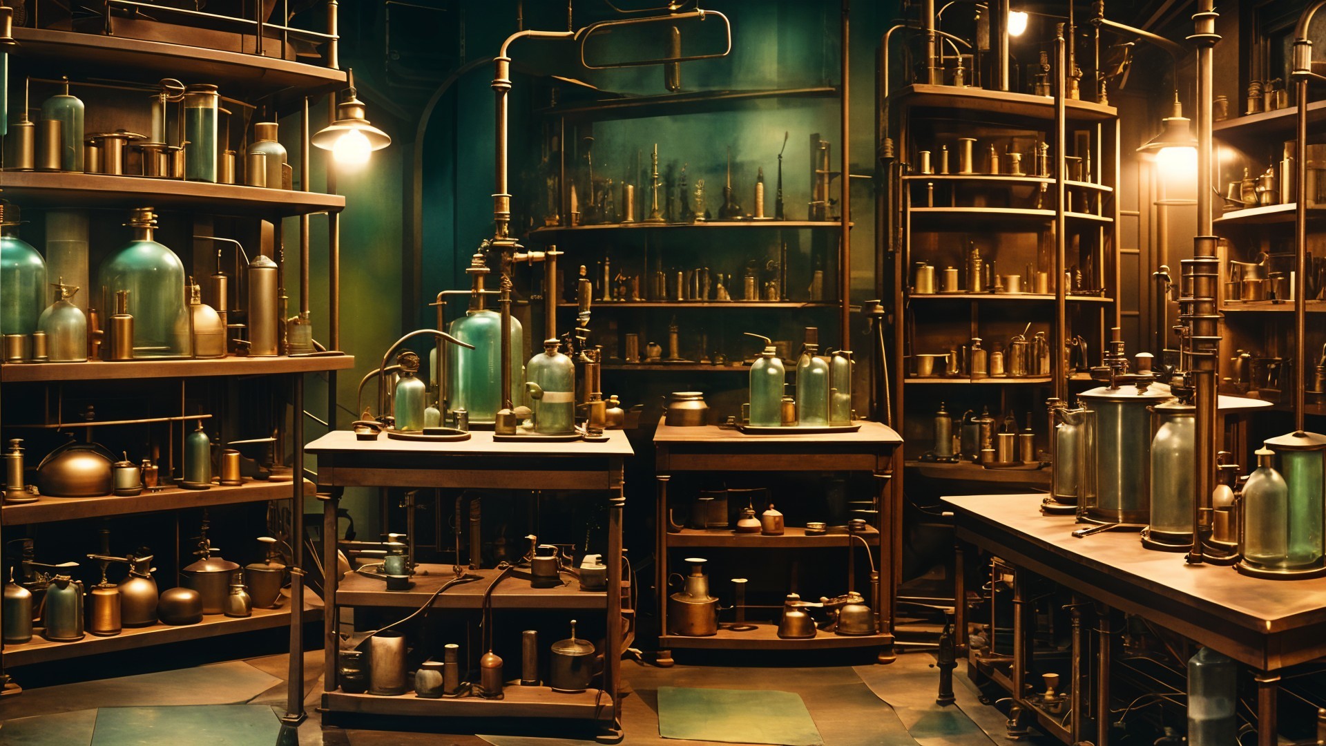 The image depicts a vintage apothecary filled with glass bottles of various shapes and sizes, arranged on dark wooden shelves. Warm lighting creates an inviting, mysterious atmosphere.