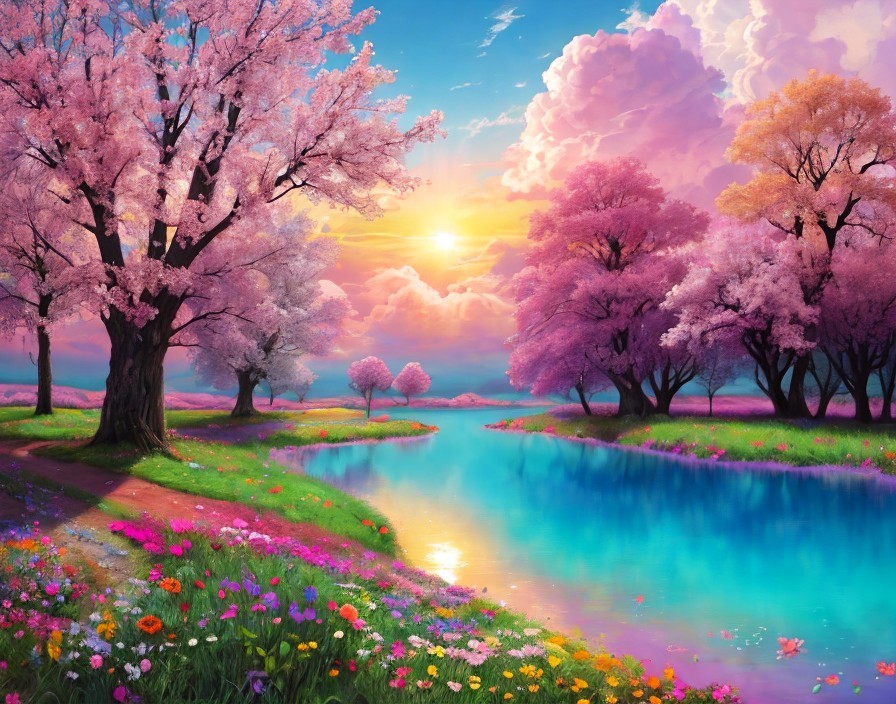 Prompt: image base + extraordinary SOFT COLORFUL AND VIVID SURREALIST SOFT INTRICATE CLOUDS SKY LAND LAKE RIVER SOFT AND VIVID colorful landscape using (((ALL the color palette completely))) ,FLOWERS CIRCLES SUN IN DIFFERENT SHADES ON THE HORIZON WHITE PINK RED PURPLE TURQUOISE, GREEN YELLOW ORANGE FUCHSIA styled by NICOLETTA CICCOLINI, INTRICATE SURREALIST CLOUDS +KAROL BAK + JOSEPHINE WALL+ KANDINSKI, TREES, RIVER, FLOWERS, MOUNTAINS A GREAT SUN DIFFERENT SHADES OF ORANGE AND CREAMY YELLOWS MULTICOLORED FLOWERS RIO CAUDALOSO, REFLECTS THE BRIGHTNESS OF THE SUN UNIQUE SURPRISING, RED PINK PURPLE, HOUSE LIGHTS, PINE FLOWERS VEGETATION"