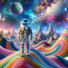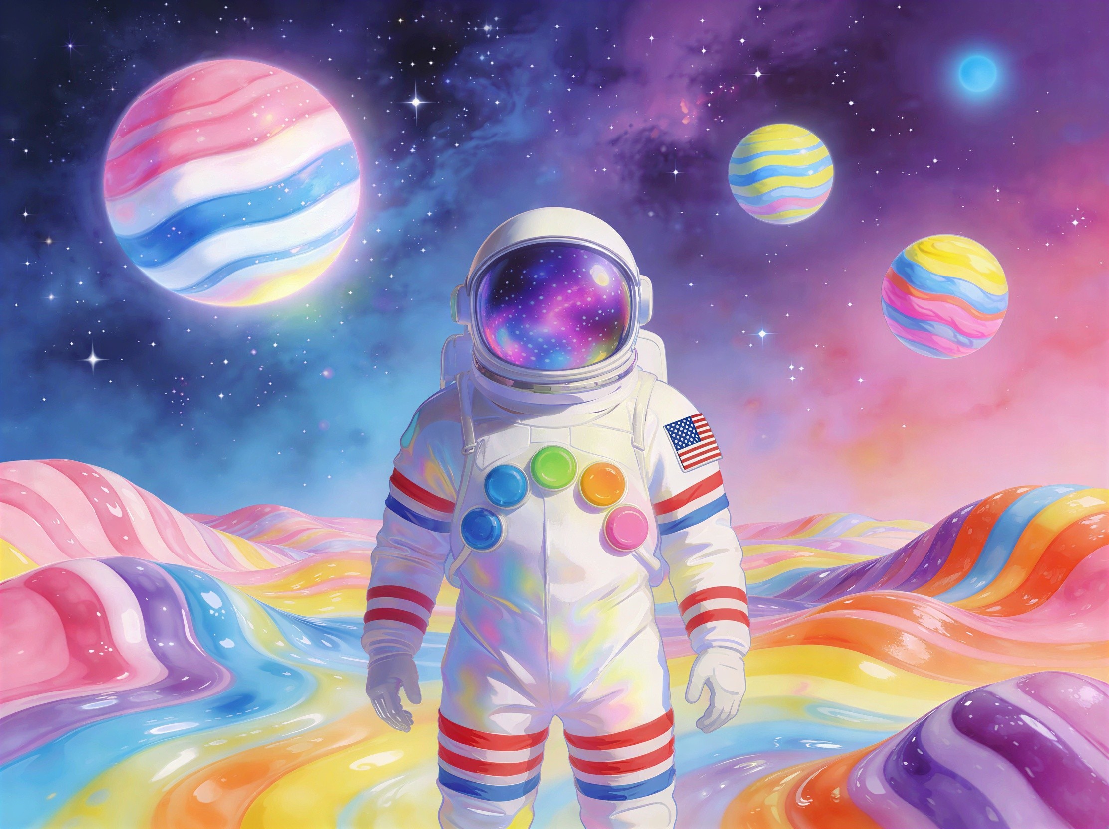 An astronaut stands on a vibrant, rainbow-colored landscape made of glossy, wavy hills in a surreal, candy-themed space scene. The astronaut's white suit has red and blue stripes on the arms and legs, a patch of the American flag on the left shoulder, and four colorful circular buttons
