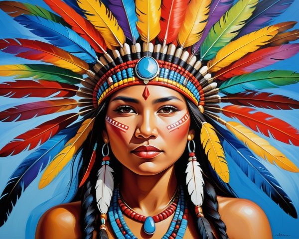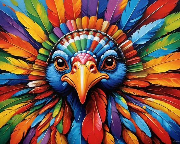 A vibrantly colored, fantastical owl with a mix of bright hues perched on a mossy branch in a lush green setting.