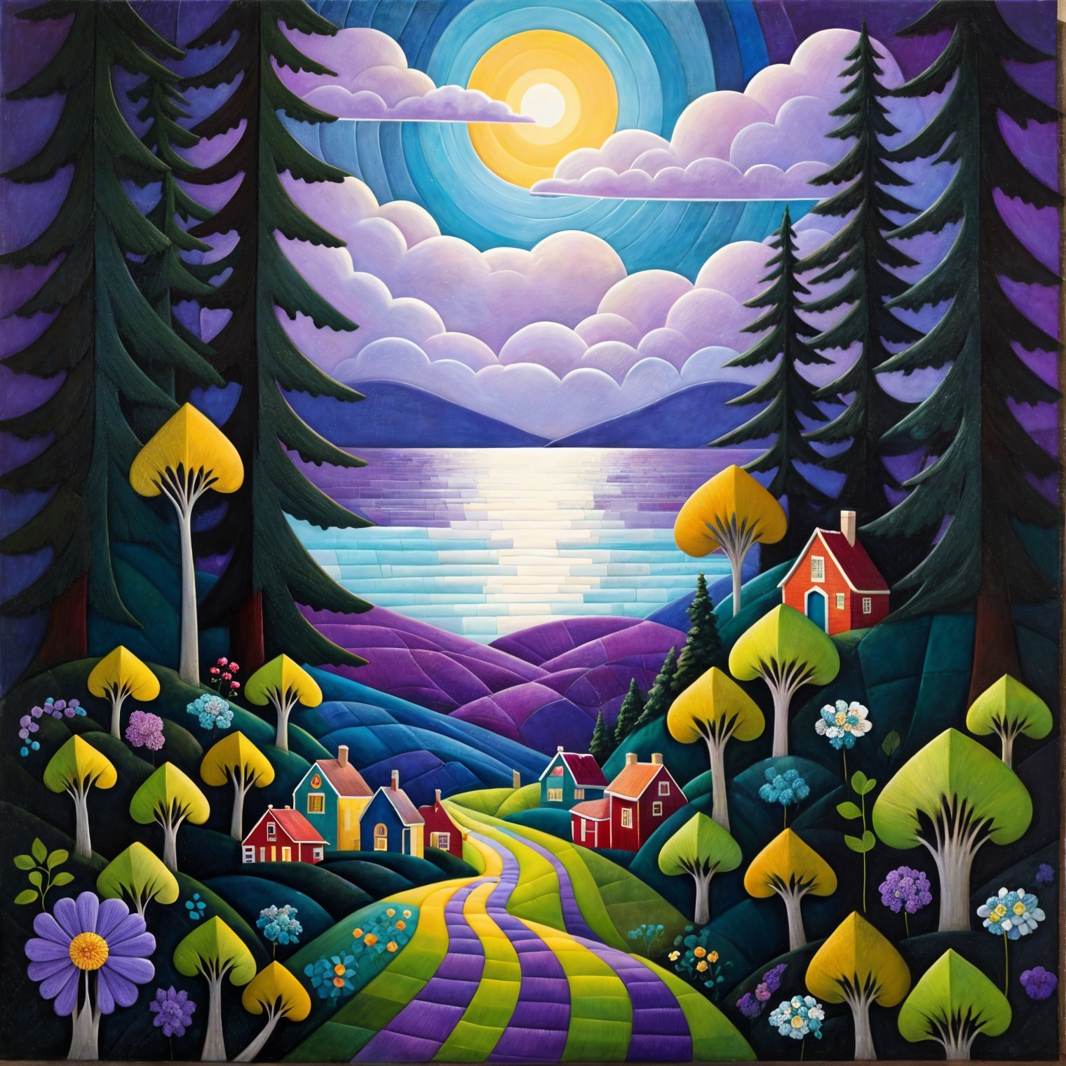 A whimsical patchwork village unfolds across rolling hills, painted in bold vibrant blocks of color. Houses with tilted roofs, patterned windows, and textured walls cluster together like quilted fabric squares. The landscape feels joyful and decorative, layered with floral motifs, spiraling trees, and glowing pathways winding between cottages. The patchwork fields shimmer in hues of teal, ochre, crimson, lavender, and deep turquoise, blending with painterly skies filled with oversized suns and drifting moons. Inspired by Meghan Duncanson’s vibrant quilt-like compositions, Jennifer Lommers’ playful decorative energy, and Didier Lourenço’s dreamy warmth and figurative charm. The artwork combines modernist patchwork abstraction with whimsical realism, glowing in ultra-detailed painterly textures. Ornate, colorful, surreal yet inviting — a dreamlike patchwork world of villages and fields.