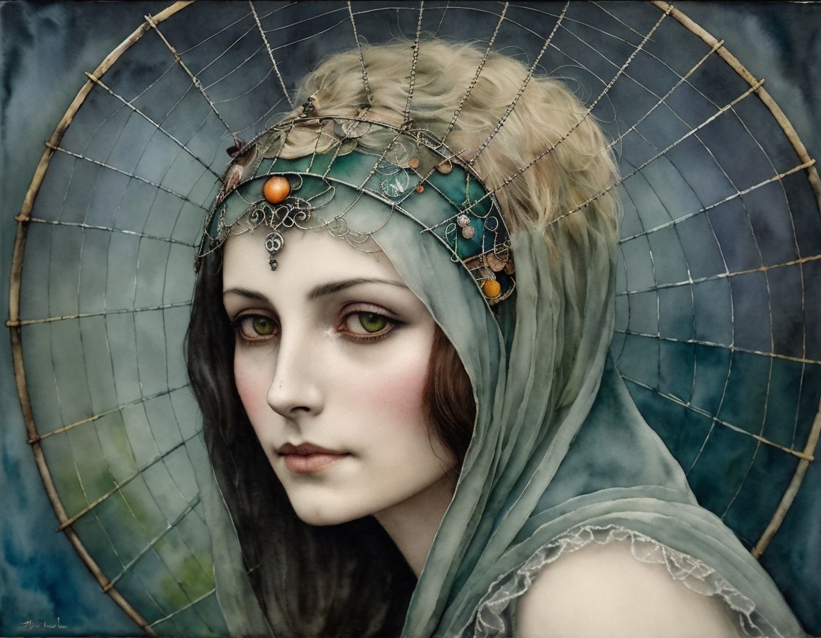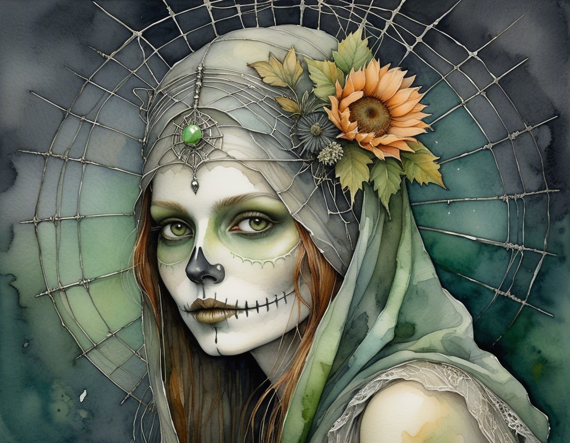 The artwork features a hauntingly beautiful figure with a skull-like face, adorned with delicate patterns. She wears a flowing veil and a vibrant sunflower, blending life and death themes.