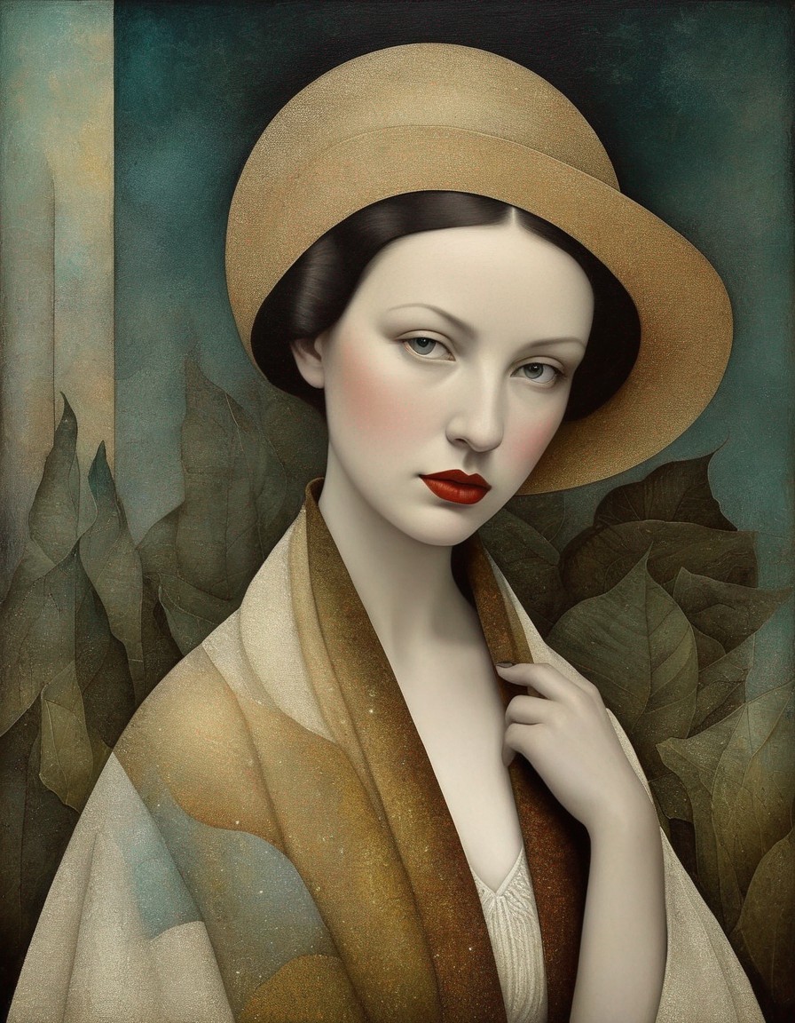 A stylized portrait of a woman with a straw hat, red lips, and a vintage backdrop, exuding a classic, elegant aura.