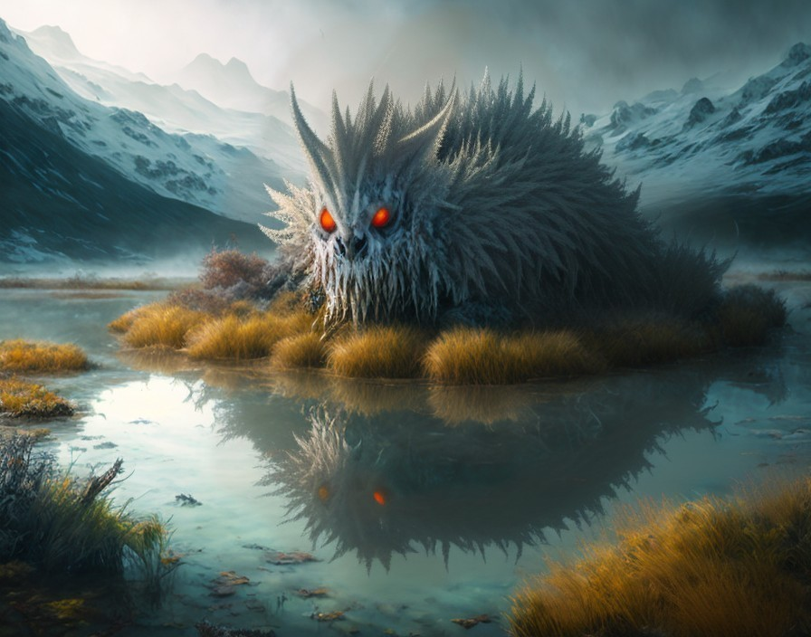 A mythical creature with red eyes and spiky fur looms near a serene mountain lake under a misty, ethereal atmosphere.