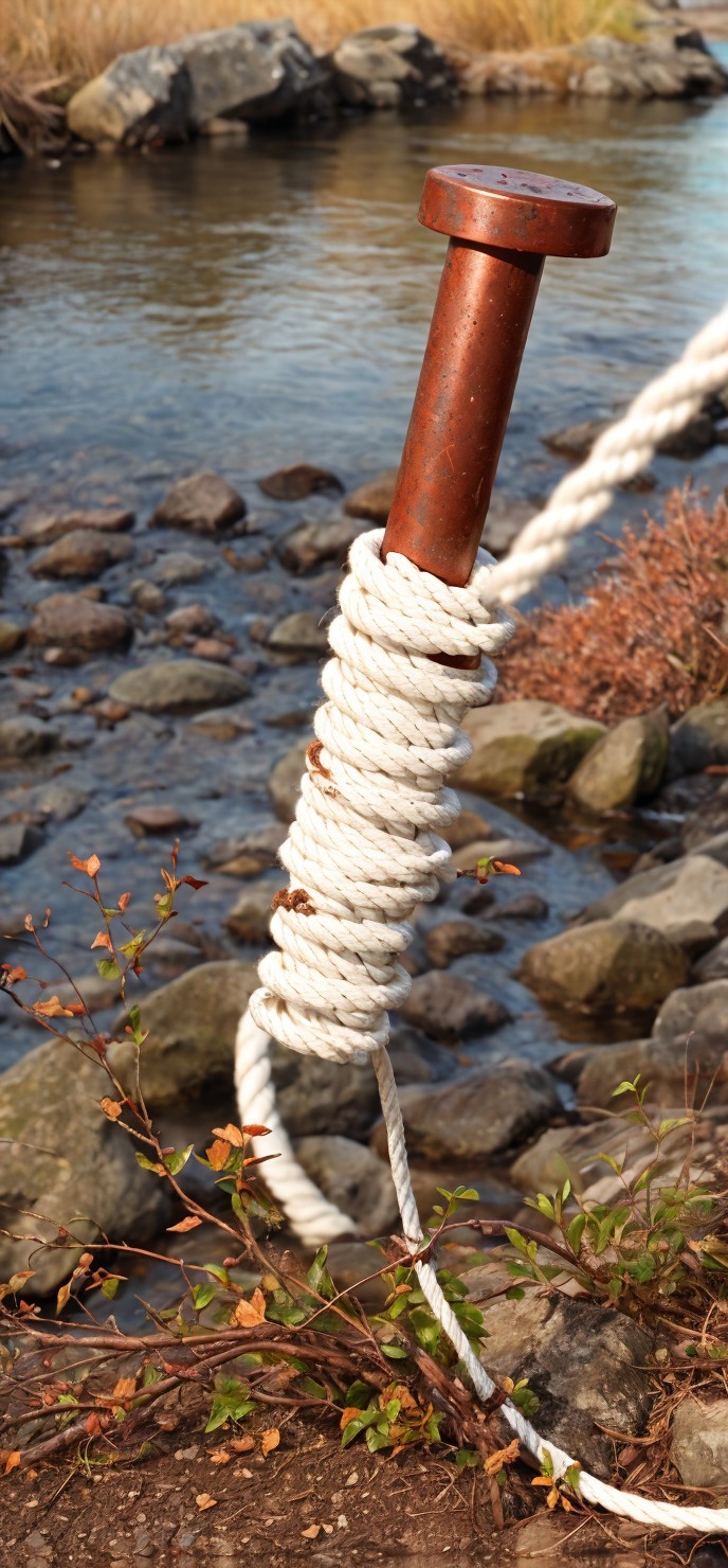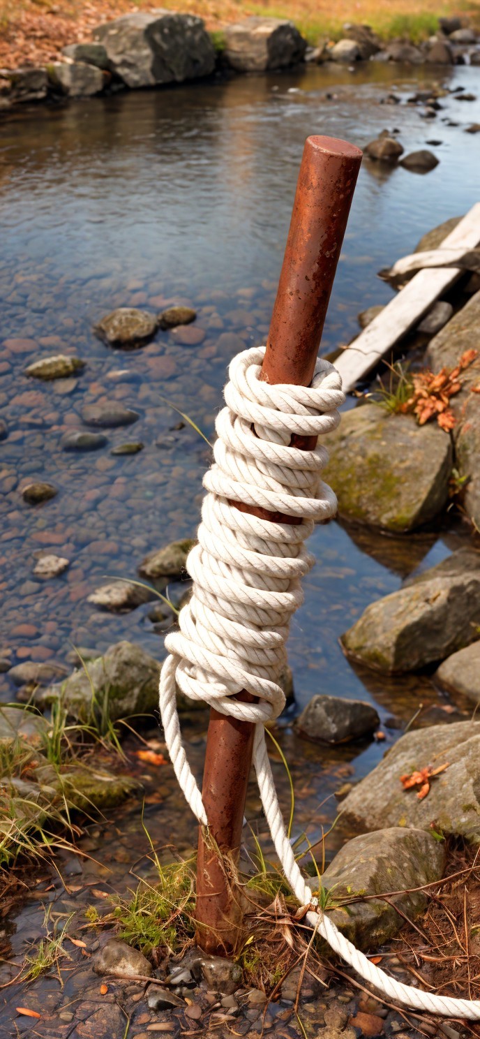 Rusty Pole in Stream Surrounded by Stones and Grass