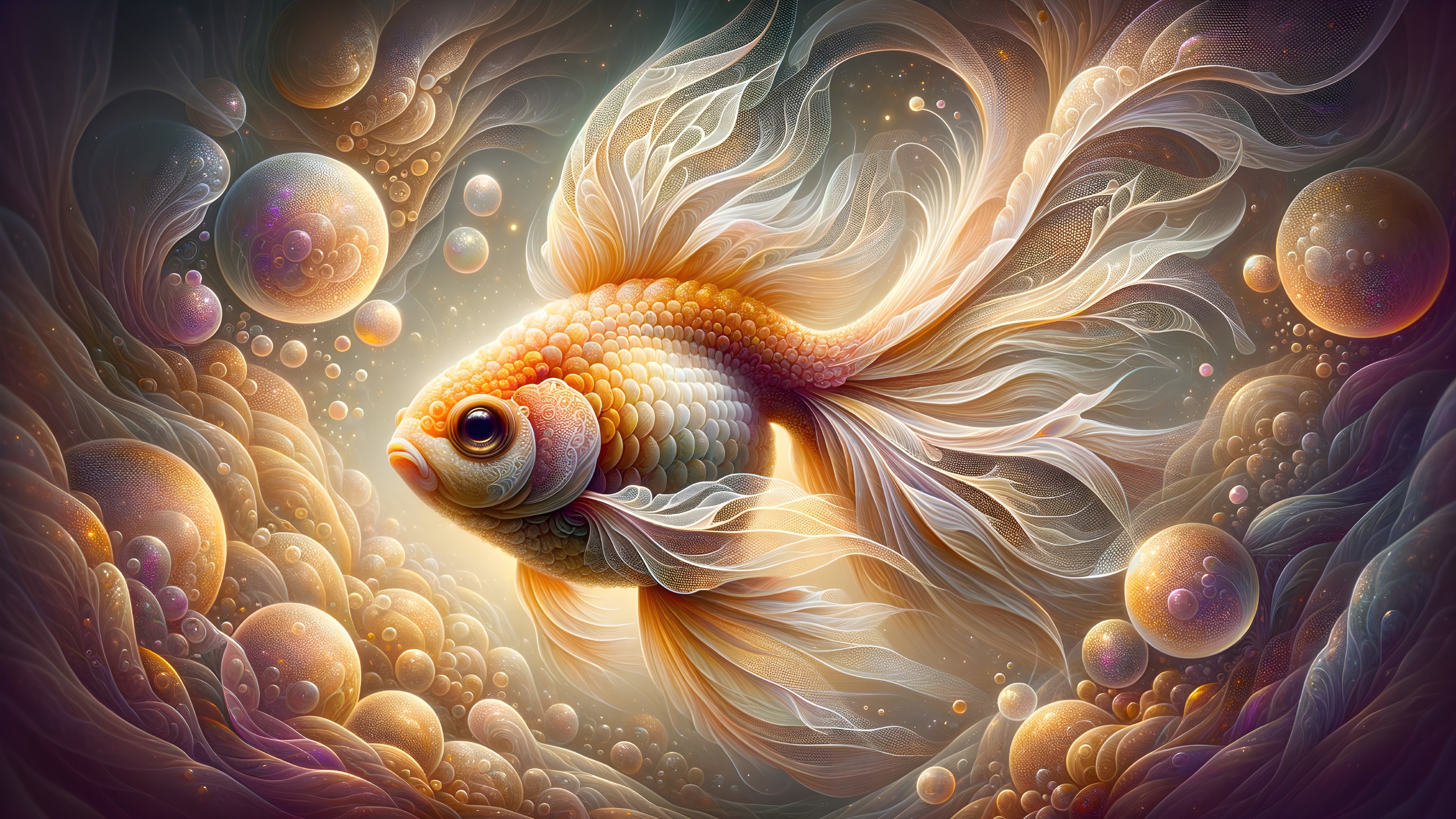 An intricately detailed goldfish swims gracefully in a dreamy underwater world. Its translucent scales shimmer in soft orange and gold, while flowing fins display whimsical patterns. Surrounded by gentle bubbles and abstract shapes, the scene features soft pastels, enhancing the enchanting atmosphere. The fish's expressive eyes reflect the gentle light, adding to the sense of wonder.