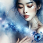 A captivating portrait of a woman surrounded by soft blue and purple watercolor florals. She gazes softly, with delicate features and a gentle expression, evoking a sense of tranquility and beauty.