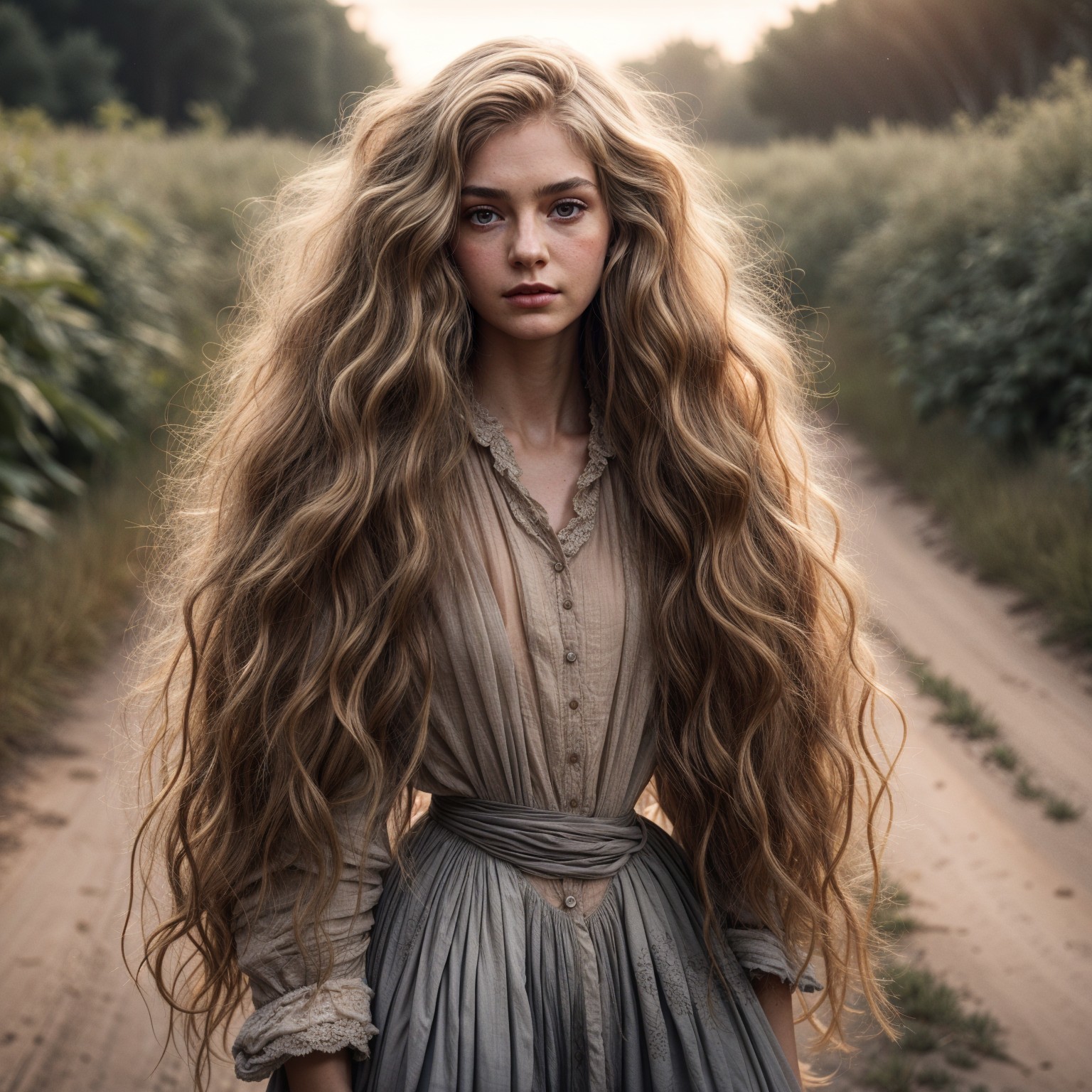A young woman stands in a sunlit path surrounded by greenery, her long, flowing hair cascading around her. She wears a vintage, button-up dress, exuding a serene and ethereal vibe.