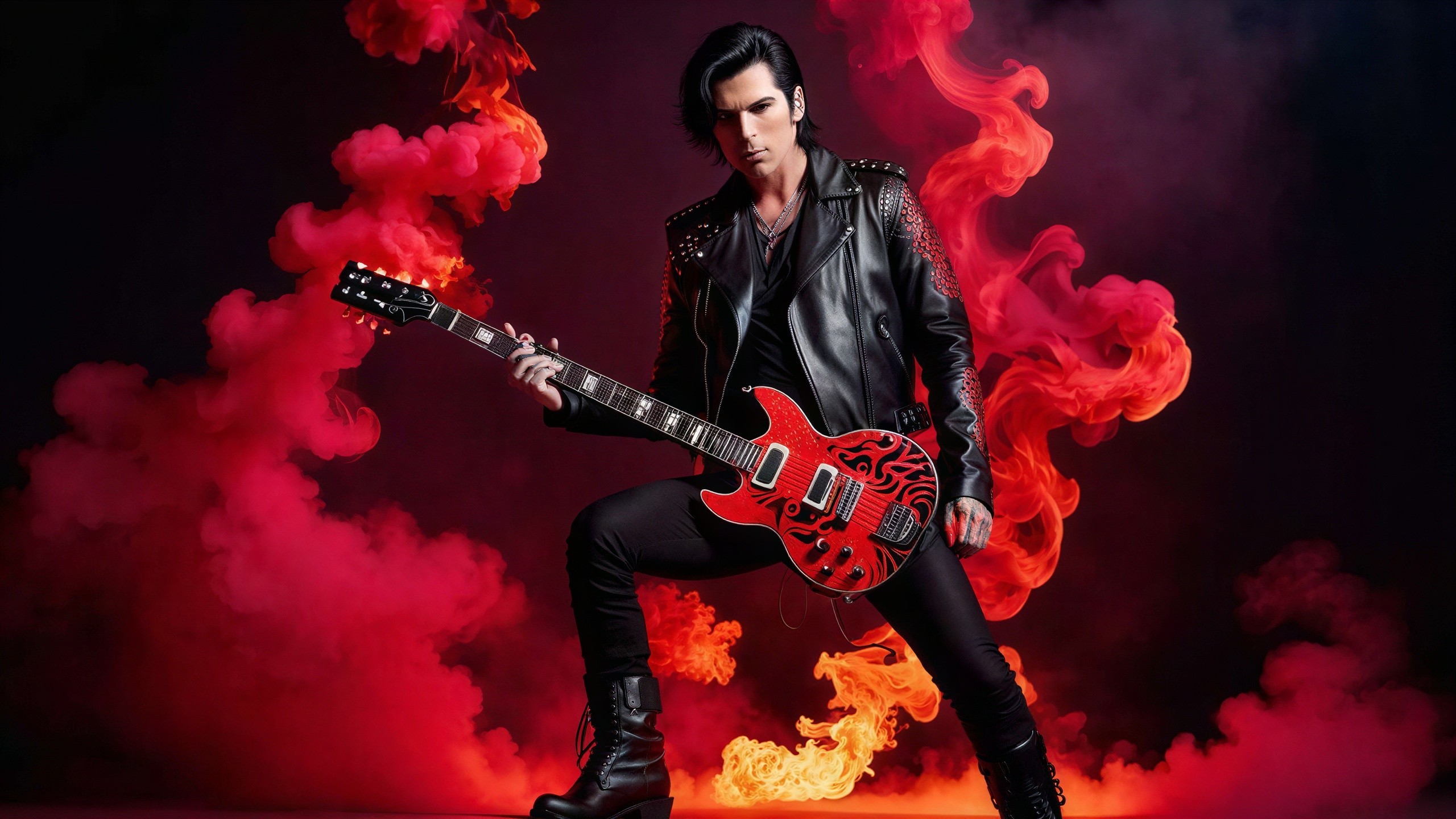 A dark-haired man in a black rockstar outfit, consisting of a spiked leather jacket, black shirt, and black pants, stands in a dynamic pose holding a red electric guitar with a black tribal flame design. He is facing forward, looking intensely at the viewer, with his right foot slightly forward
