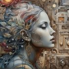 The image features a textured, artistic depiction of a profile of a woman with a serene expression, wearing a beautifully detailed headscarf in green and gold tones, set against an ornate background.