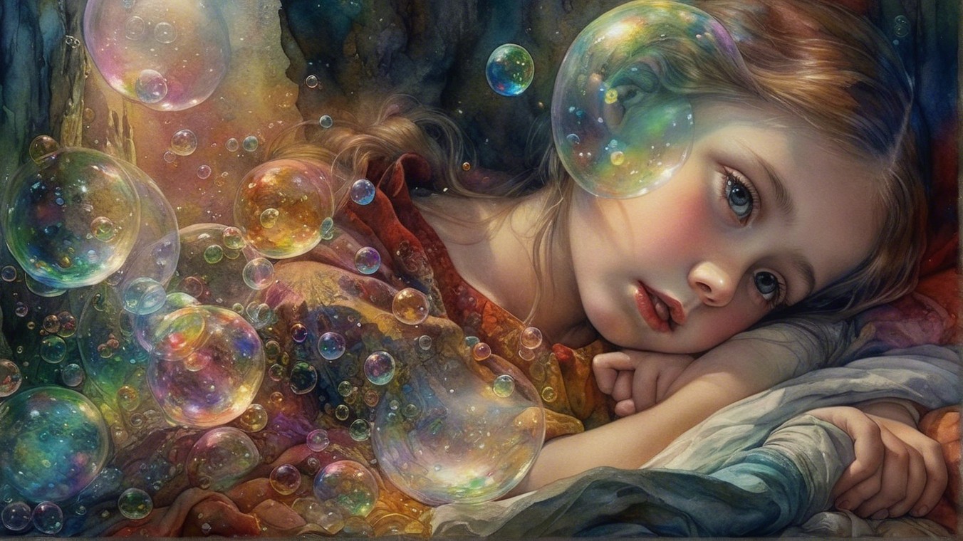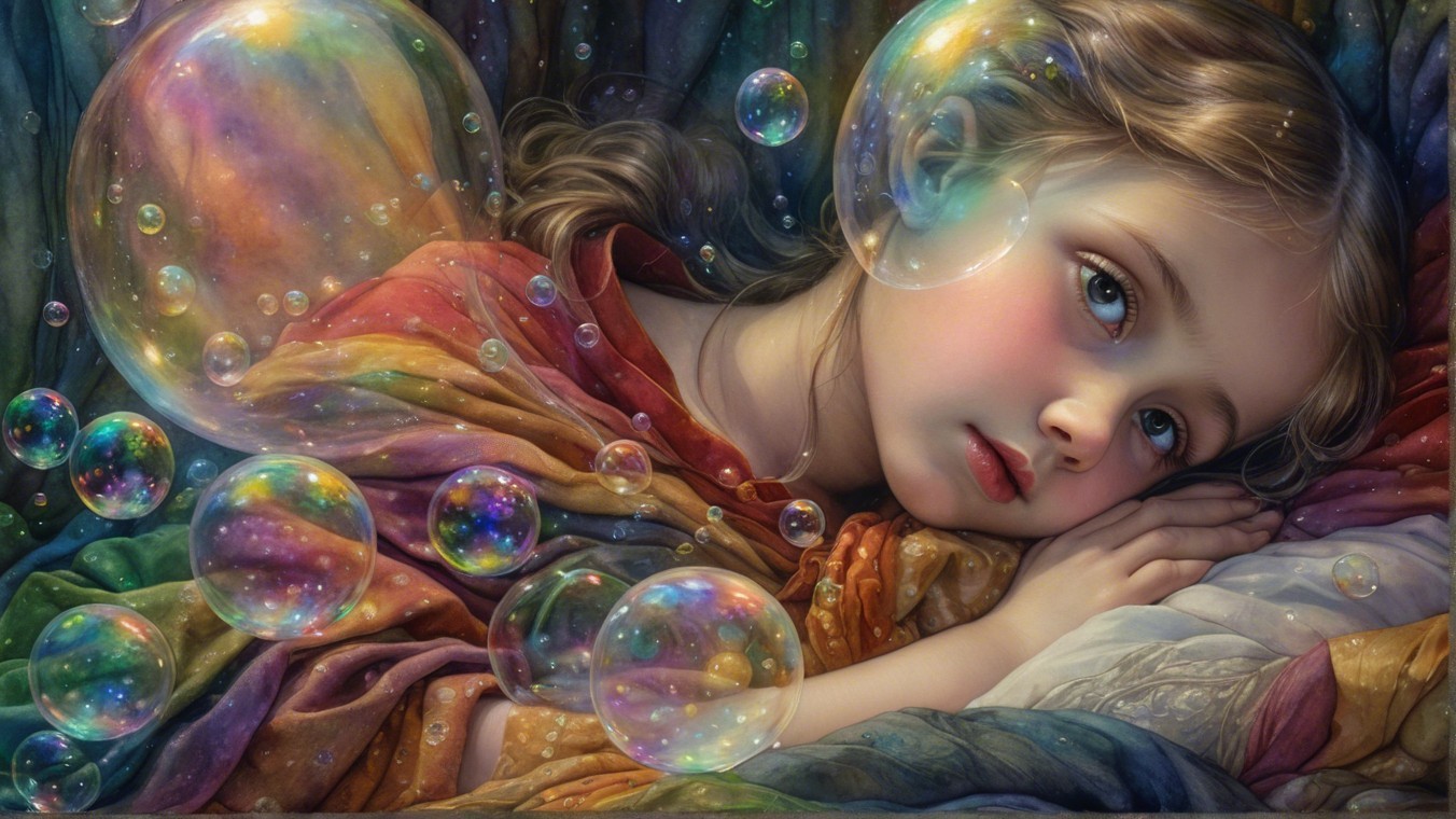 A young girl in a colorful rainbow-striped sweater gazes dreamily, resting her head on a vibrant pillow. Bubbles float around her, enhancing the whimsical, magical atmosphere of the scene.