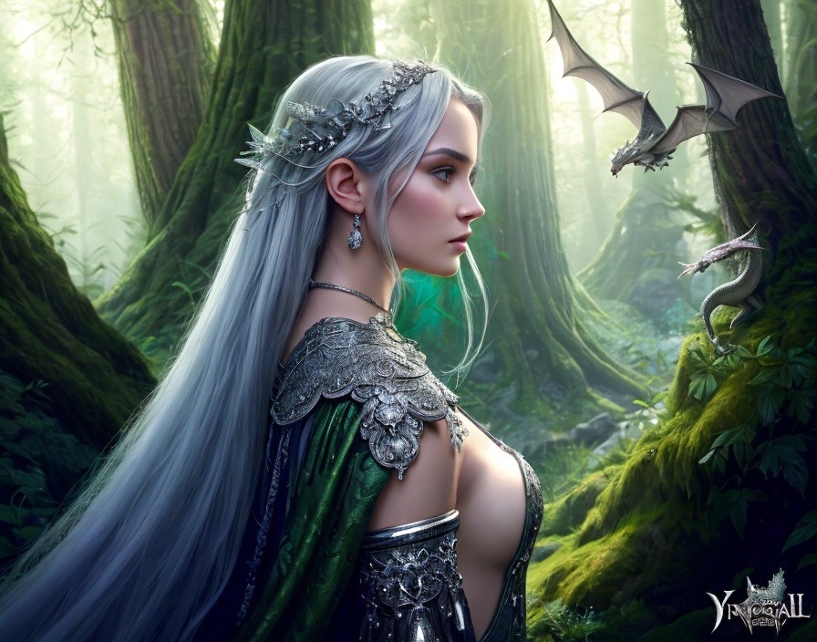 Prompt: "far away view of stunning princess with dragon and mytical creatures in the forest, mystical, magical, silver, black, green, metalic, glass skin, cellular skin, long white and silver hair, glossy, medieval, fantasy, lord of the rings, mytical, landscape, dragon,"