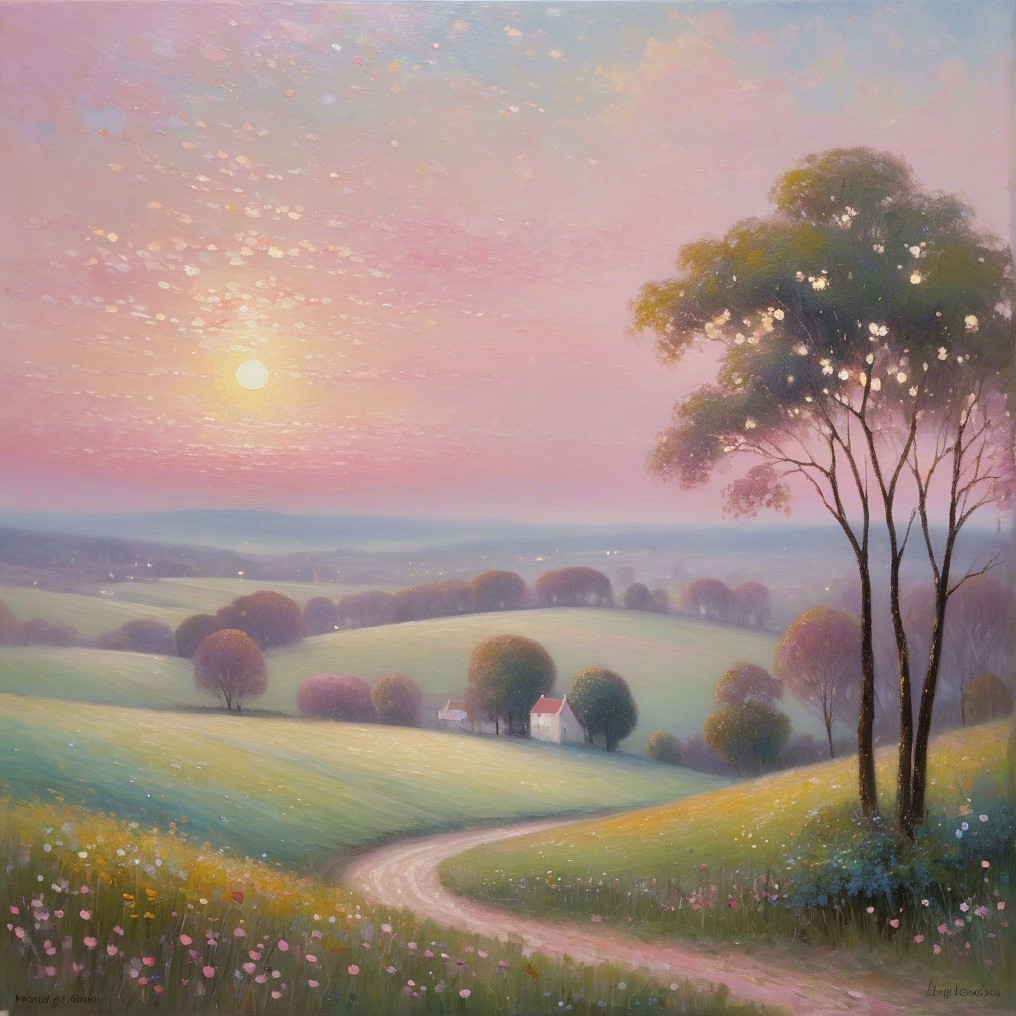 A serene landscape at sunrise, featuring gentle hills and a winding path. Soft pastel colors of pink and gold illuminate the scene, with trees and blooming flowers enhancing the tranquil vibe.
