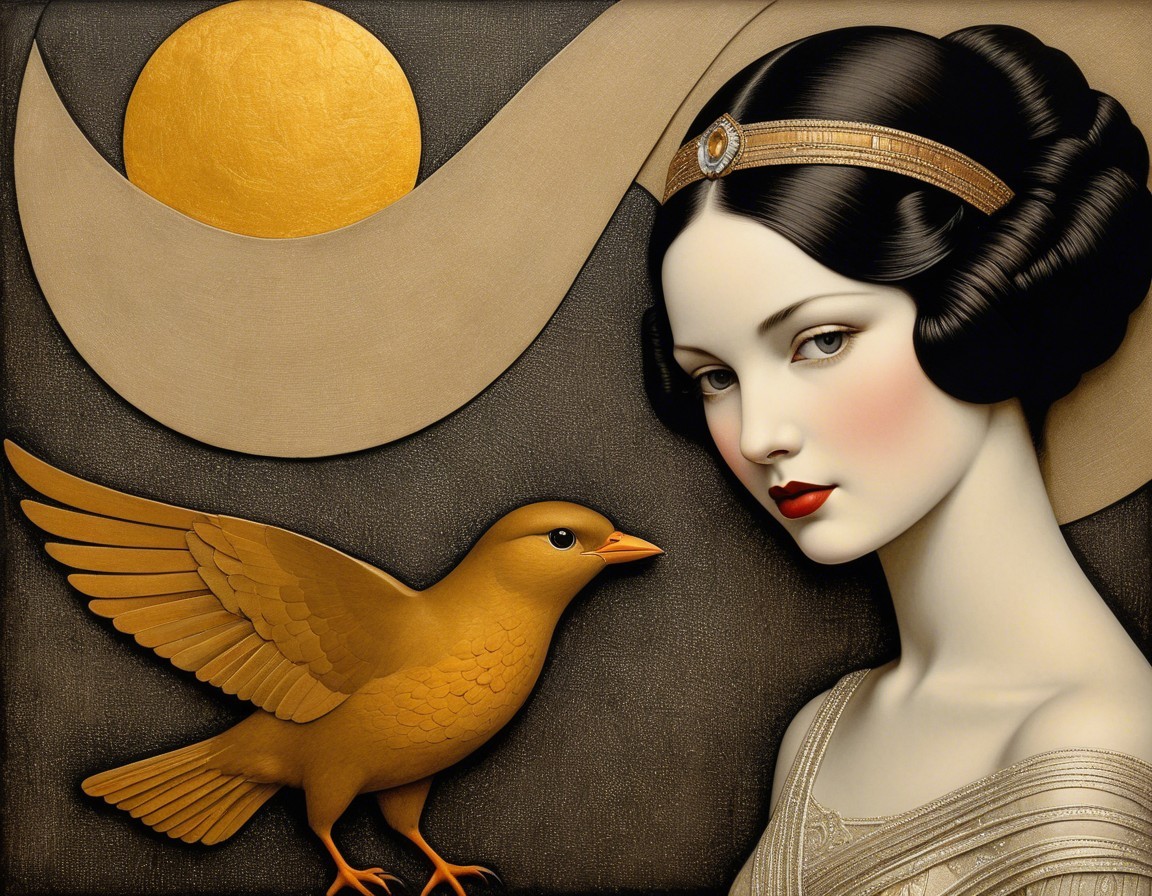 A stylized portrait of a woman with dark, wavy hair adorned with a floral hairpiece. The background features elegant golden tones and intricately woven botanical designs.