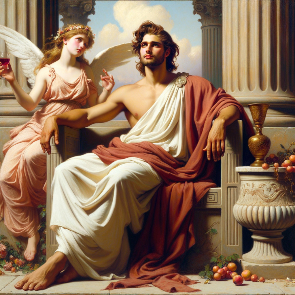 Socrates with his daimon ! A classical painting depicting a bearded man and a winged woman with a cup, surrounded by fruits and rich detailing.