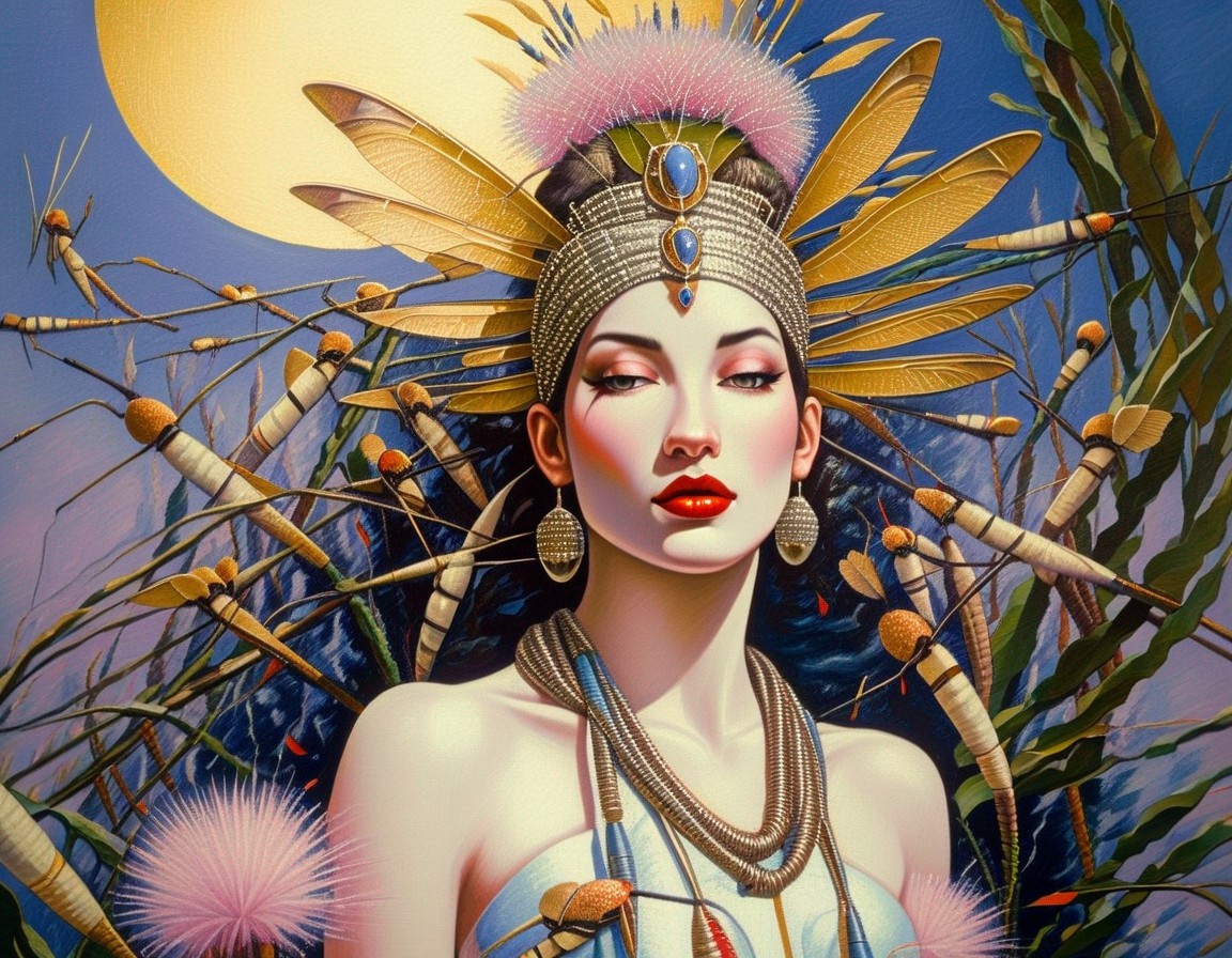 A fantasy illustration of a woman with dragonfly wings and a crown, set against a blue sky, reeds, and a pale moon.